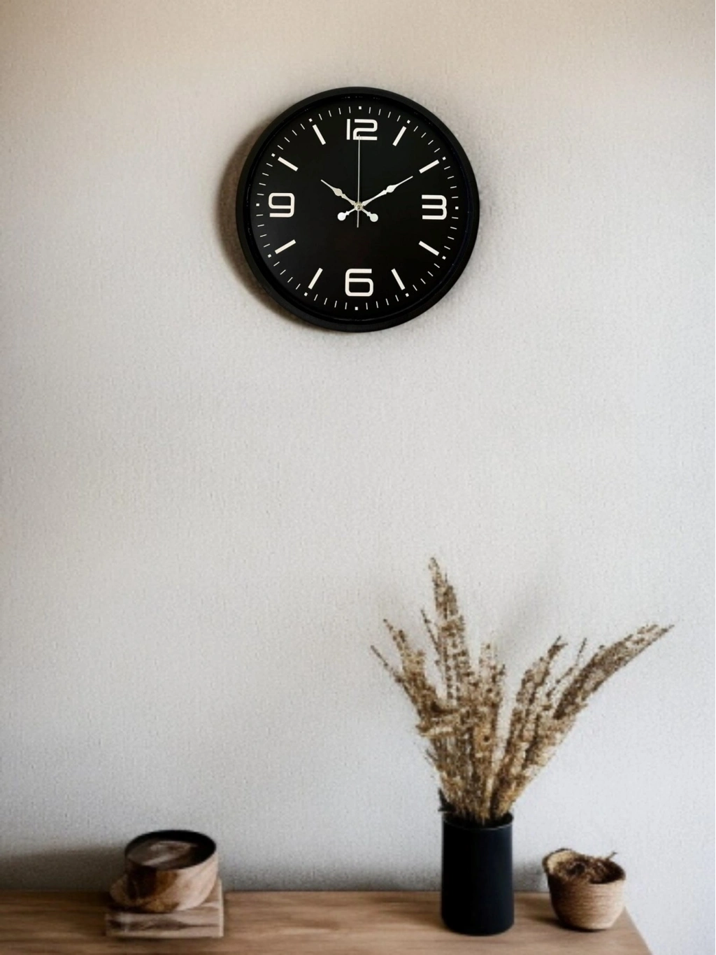 Mat siyah çerçevesi ve siyah kadranı üzerinde yer alan beyaz rakam ve indeksleri ile tasarlanan bu 36 cm duvar saati, güçlü kontrastı sayesinde saati tek bakışta net şekilde okuma imkânı sunar. Sade ve dengeli kadran tasarımı, modern yaşam alanları için zamansız bir şıklık sağlar.