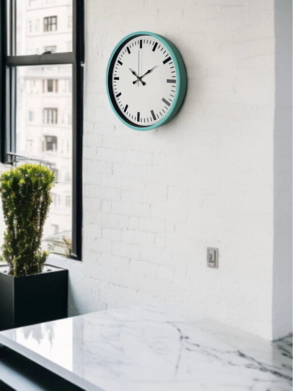 Turkuaz çerçevesiyle bulunduğu ortama canlılık ve ferahlık katan bu 36 cm duvar saati, sade kadran tasarımıyla modern dekorasyonlara şık bir uyum sağlar. Beyaz zemin üzerine yerleştirilen siyah çizgi indeksler, saatin okunurluğunu artırırken minimal bir görünüm sunar.