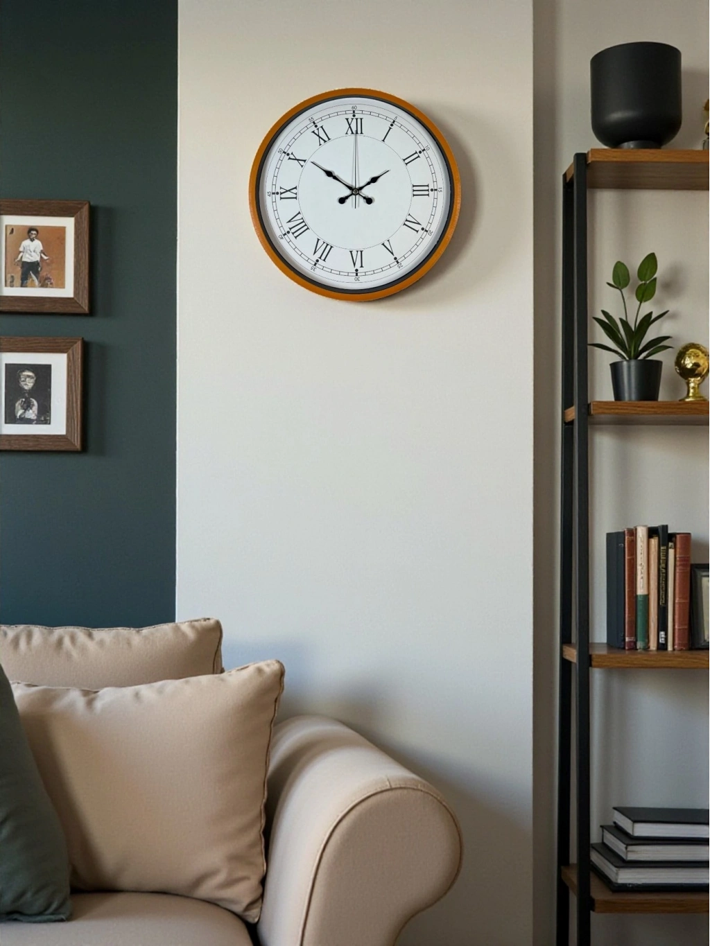 Turuncu çerçevesi sayesinde klasik tasarıma enerjik ve modern bir dokunuş katan dekoratif bir duvar saatidir.