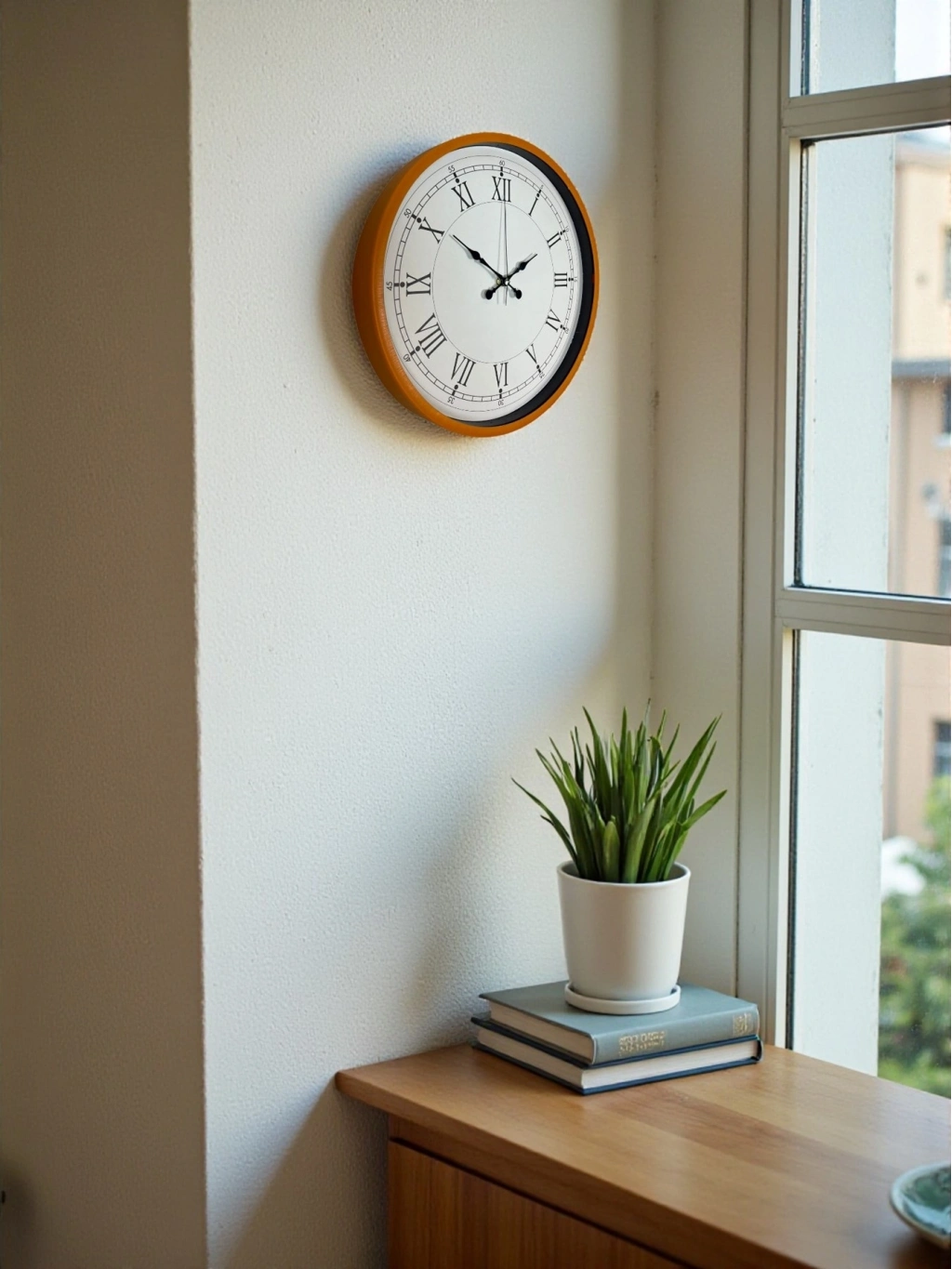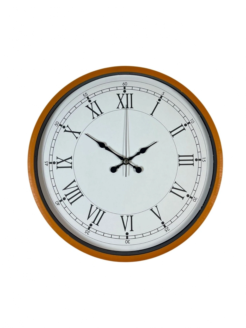 Canlı turuncu çerçevesiyle dikkat çeken bu 36 cm duvar saati, klasik Roma rakamlı kadran tasarımıyla zamansız bir şıklık sunar. Beyaz zemin üzerine yerleştirilen siyah Roma rakamları, saatin okunurluğunu artırırken dekorasyona güçlü bir karakter kazandırır.