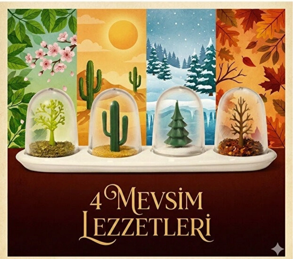 Mutfağınıza şıklık ve fonksiyonellik katacak 4 Mevsim Temalı Tasarım Baharatlık Seti, dekoratif ağaç ve kaktüs figürlü standıyla dikkat çekiyor. Bu özel set, tuzluk ve biberlik olarak kullanıma uygun olup, her öğününüze estetik bir dokunuş sağlar.