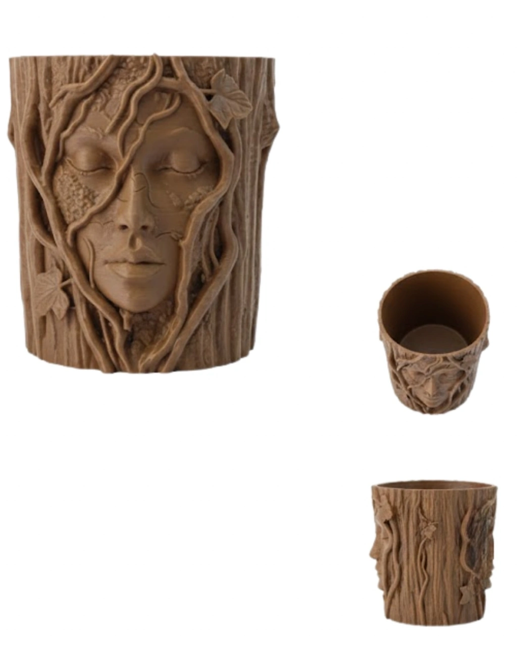 Doğanın ruhunu yansıtan yüz figürü ve ağaç dokusuyla tasarlanmış bu dekoratif saksı, sıradan aksesuarların ötesinde bir sanat parçasıdır. Toprak tonları, doğal dokusu ve üç boyutlu kabartmaları sayesinde bulunduğu alanda sofistike bir etki yaratır.Hem kendiniz hem sevdikleriniz için estetik ve anlamlı bir hediye alternatifidir.