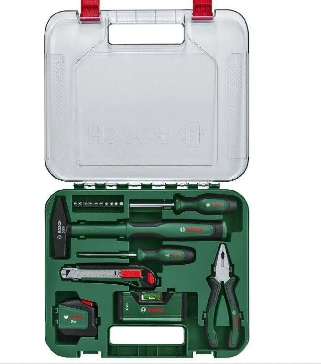 Bosch 17 parçalı üniversal el aleti seti, evde veya yolda çok sayıda DIY onarım, bakım ve dekorasyon zorlukları için doğru donanıma sahiptir. Set, 300 g'lık bir mühendis çekici, 3 m'lik bir şerit metre, kopçalı bıçak, 25 cm'lik su terazisi, kombine pense, bir bız, bir üniversal tornavida, 10 uç ve bir saklama kutusundan oluşur. Bu aletler, yüksek kaliteli malzemeler kullanılarak sağlam ve uzun ömürlü olacak şekilde üretilmiştir. Optimum konfor için yumuşak kavrama alanları veya kavisli formlar gibi ergonomik özelliklere sahiptirler.