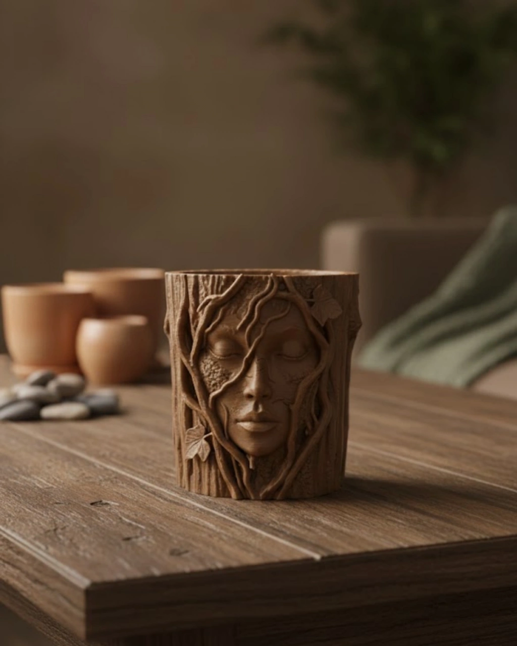 Sanat ile doğanın büyüleyici uyumunu bir araya getiren bu yüz detaylı dekoratif vazo, yaşam alanlarınıza mistik ve etkileyici bir atmosfer kazandırır. Ağaç gövdesi formu içine işlenmiş huzurlu yüz figürü, doğanın ruhunu temsil ederken bulunduğu ortama sanatsal bir derinlik katar. İnce işlenmiş sarmaşık ve yaprak detayları, ürüne üç boyutlu ve heykelsi bir görünüm kazandırır.Toprak tonlarındaki doğal rengi sayesinde hem modern hem rustik dekorasyon stilleriyle kusursuz bir uyum sağlar. Salon raflarında, çalışma masasında, meditasyon köşelerinde ya da balkon dekorasyonunda kullanıldığında bulunduğu alanı sıradanlıktan çıkarır. Işığı yumuşak şekilde yansıtan yüzey dokusu, detayların daha belirgin görünmesini sağlar.İçine yerleştireceğiniz yeşil bitkilerle birlikte doğayla bütünleşen bir kompozisyon oluşturabilir, yaşam alanınıza huzur veren bir enerji katabilirsiniz. Hem dekoratif hem de sanatsal değeri yüksek özel bir tasarımdır.