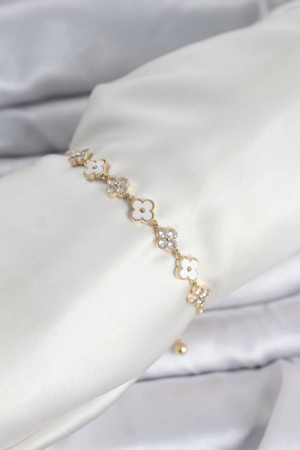 ® Gold Renk Zirkon Taşlı Sıralı Yonca Model Asansörlü Kadın Bileklik