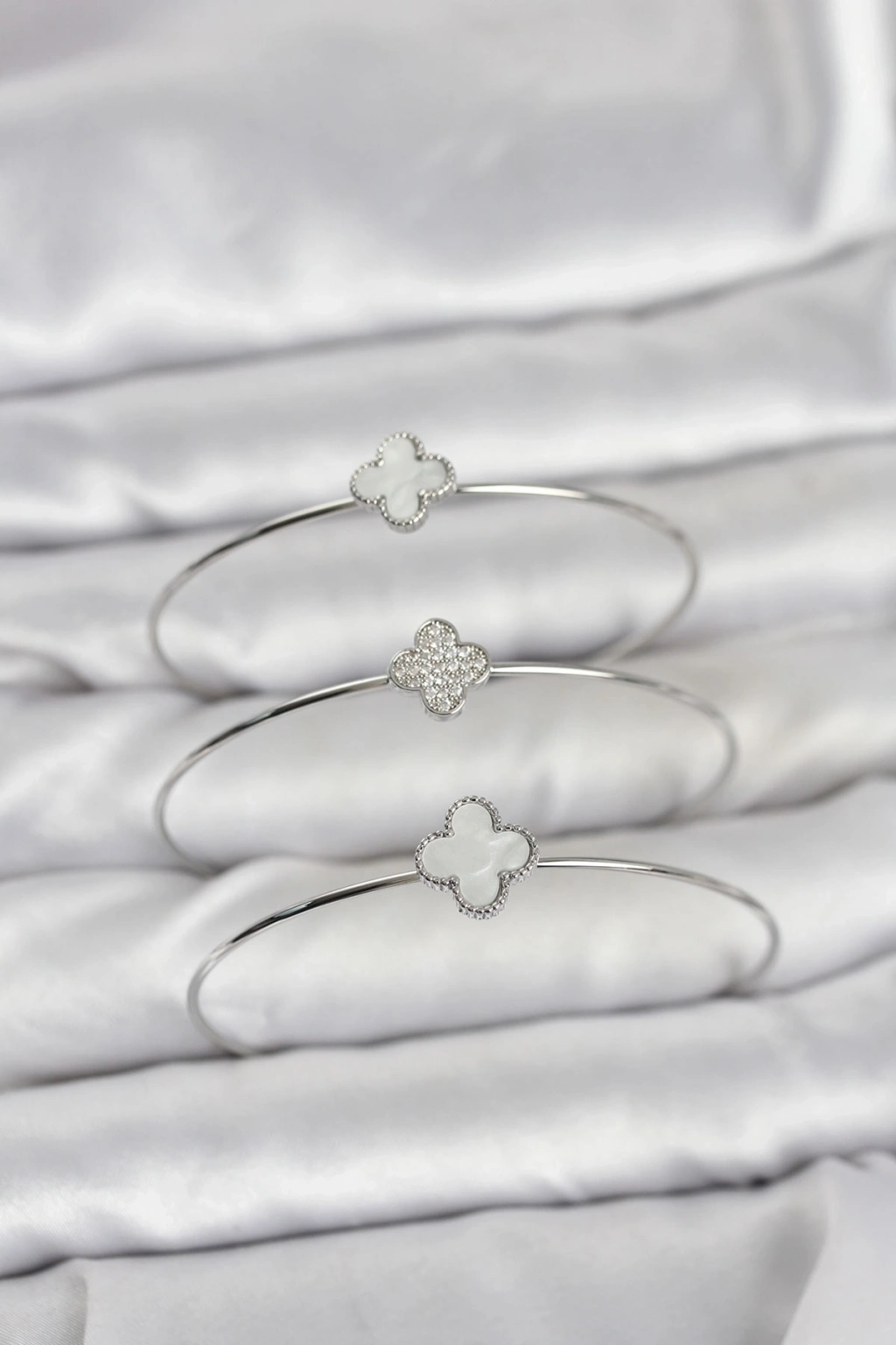 ® Gümüş Renk Yonca Model Zirkon Taşlı 3'lü Kadın Bileklik Kombini
