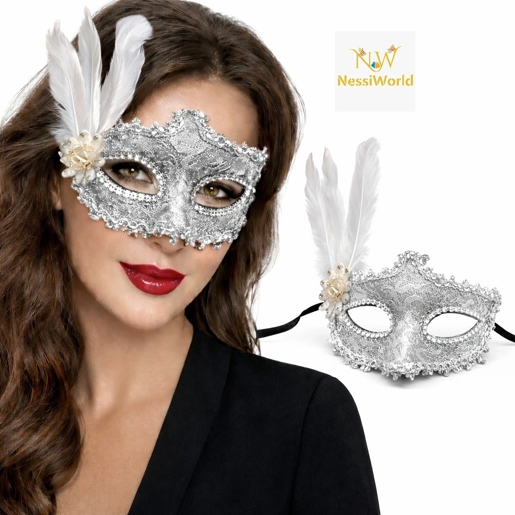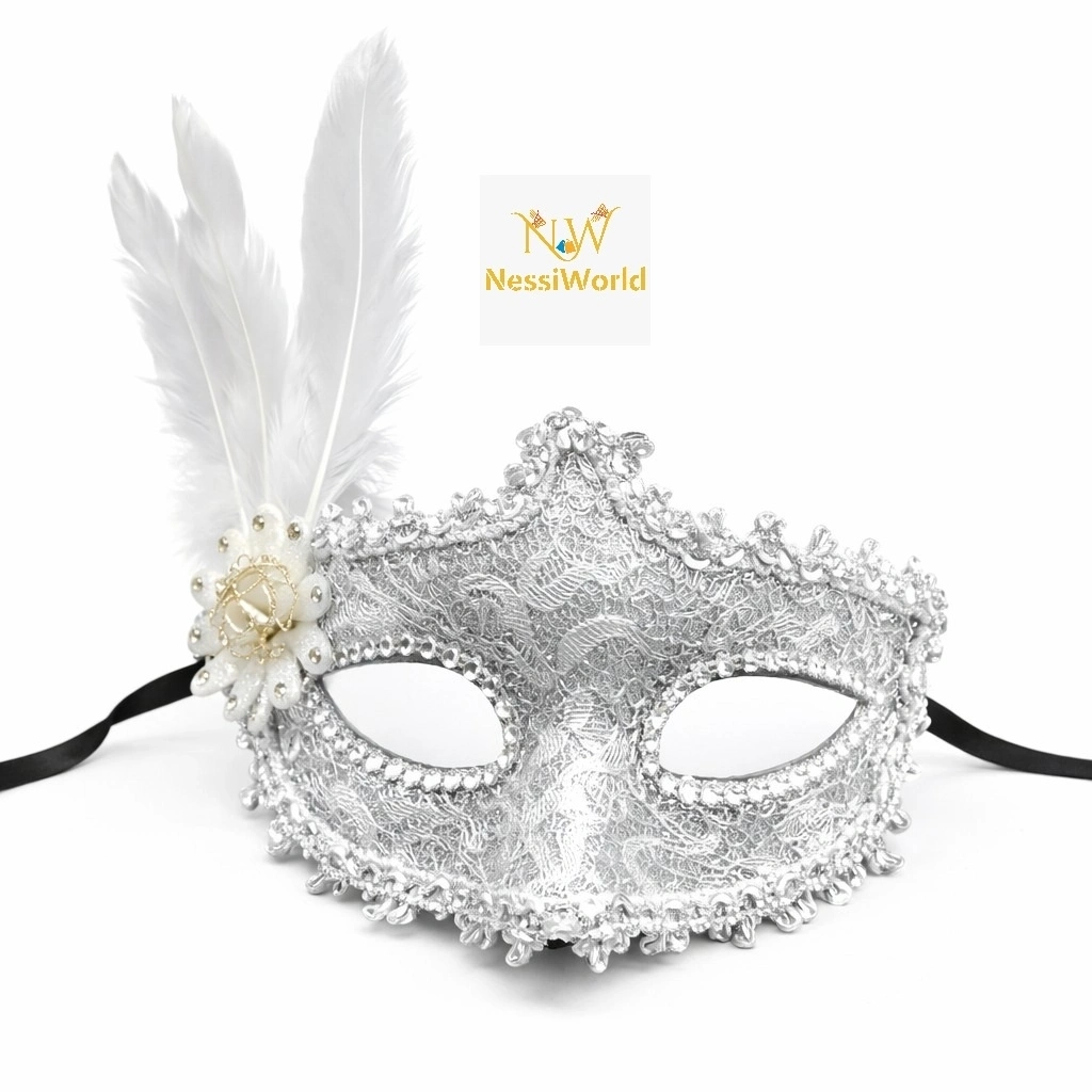 Lüks Beyaz Tüylü Venedik Maskesi – Taşlı Dantel Tasarım
