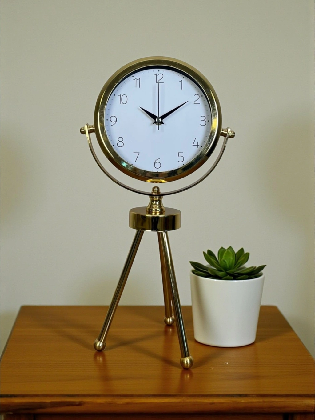 Zarif gold kaplamalı metal gövdesi ve üç ayaklı tripod tasarımıyla dikkat çeken bu masa saati, dekorasyonuna şık bir dokunuş katmak isteyenler için özel olarak tasarlanmıştır. Modern çizgilerle klasik şıklığı bir araya getiren gold parlak yüzeyi, hem estetik hem de dayanıklı bir kullanım sunar.