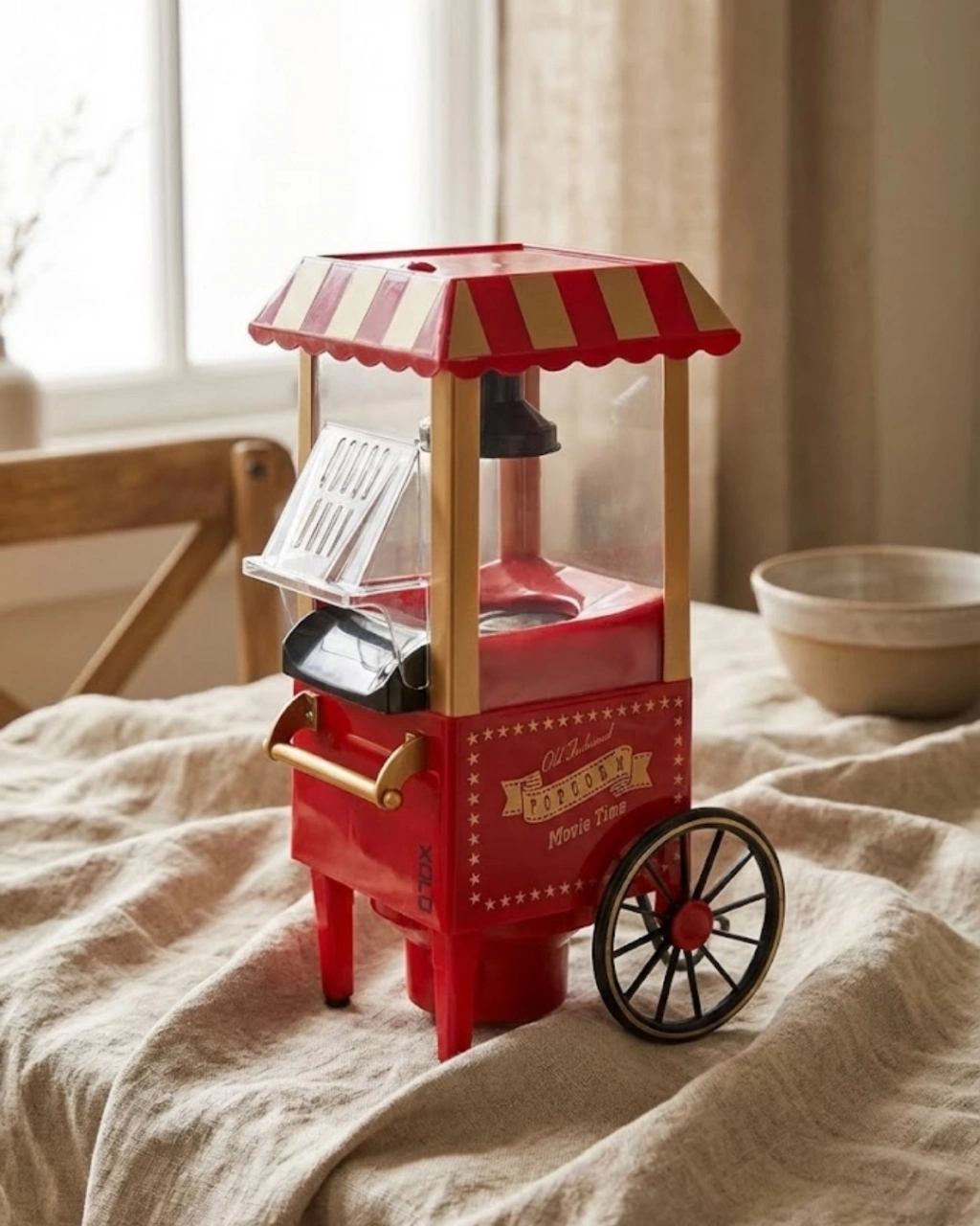 Nostaljik görünüme sahip bu yağsız popcorn makinesi, ailece keyifli anlar yaşamanız için tasarlanmıştır. Sıcak hava ile çalışan sistemi sayesinde yağ eklemeden mısır patlatır ve sağlıklı atıştırmalıklar sunar. Yapışmaz patlatma yüzeyi, mısırların eşit şekilde patlamasını sağlar.Tek seferde fazla miktarda popcorn hazırlayabilme özelliği sayesinde kalabalık ortamlarda rahat kullanım sunar. 5 dakika içinde hazır hale gelen popcorn, zamandan tasarruf sağlar. Film geceleri, çocuk etkinlikleri ve ev eğlenceleri için idealdir.Hem eğlenceli hem fonksiyonel yapısı ile öne çıkan bu popcorn makinesi, sağlıklı yaşamı tercih eden kullanıcılar için pratik bir çözümdür.