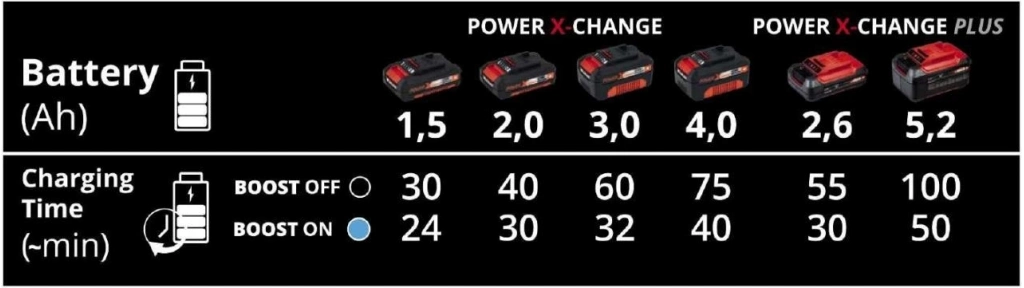 Power X-Change serisi aküler için 6 A'lik ultra hızlı şarj cihazı Power X-Boostcharger. Boostcharger şarj cihazı üzerindeki mod butonu ile çok kısa sürelerde PXC akünüzü şarj edebilirsiniz. Power X-Change serisindeki tüm cihazlar aynı tip akü ve şarj cihazı ile kullanılabildiği için zaman ve kaynak tasarrufu sağlayarak kullanıcıya büyük fayda sunarlar. Mikroişlemci teknolojisi ile akü şarj edilirken etkin olarak izlenerek aşırı şarj ve ısınmaya karşı tam koruma sağlanır. Şarj durumunun takibi için 6 kademe durum göstergesi vardır ve derin deşarj olan aküler tamir modunda şarj edilir. Şarj cihazını askı deliklerini kullanarak isterseniz duvara monte edebilirsiniz.