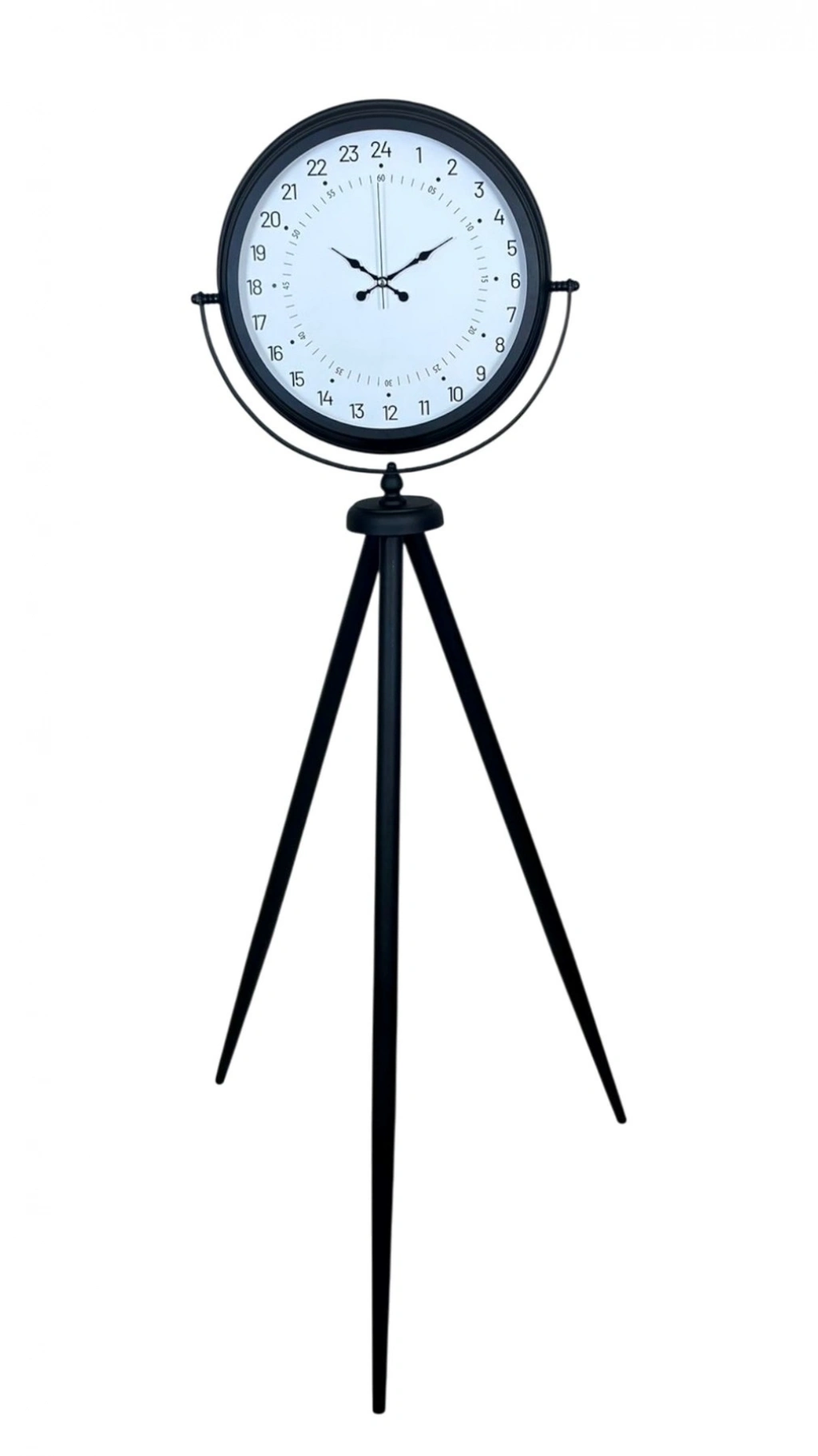 150 x 45 cm ölçüsüyle geniş salonlar, ofisler, antreler, mağazalar ve vitrin alanları için ideal olan bu model; siyah metal tripod ayak yapısı sayesinde modern, loft ve endüstriyel dekorasyonlara kusursuz uyum sağlar. Tripod formu zeminde dengeli bir duruş sunarken, mekâna mimari bir şıklık katar. Saat yalnızca zamanı göstermez, aynı zamanda bulunduğu alanın dekoratif odak noktası haline gelir.