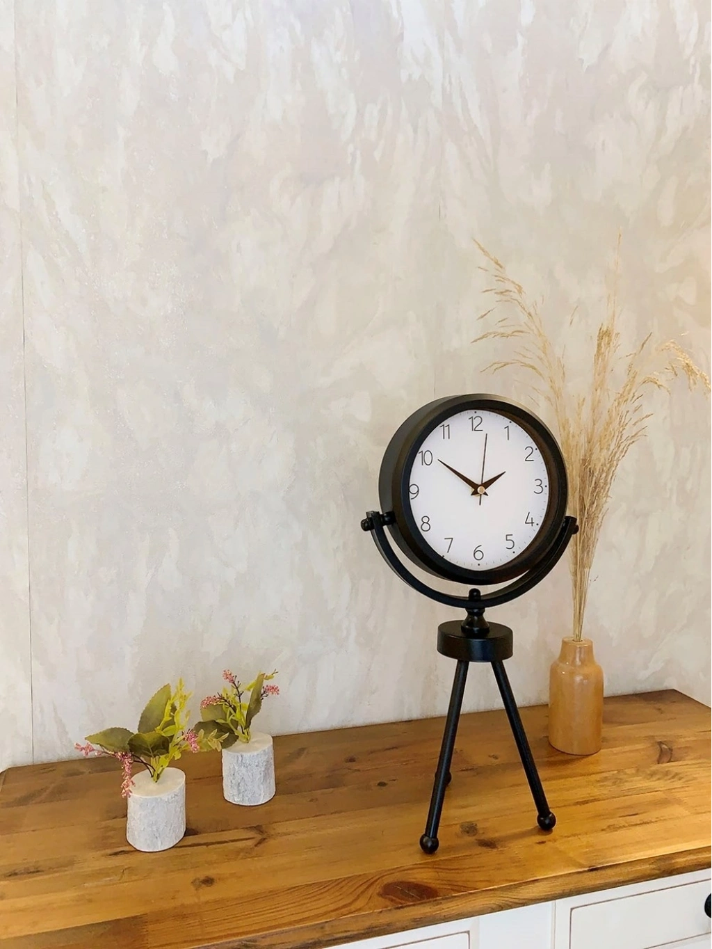 Şık ve modern tasarımıyla dikkat çeken  siyah fırın boyalı  mini tripod masa saatimiz, sessiz akar saniye mekanizmasıyla konforlu bir kullanım sunar. Gerçek cam koruma paneli sayesinde uzun ömürlü ve dayanıklıdır. Estetik görünümüyle hem ev hem de iş yerleri için ideal bir dekoratif üründür.