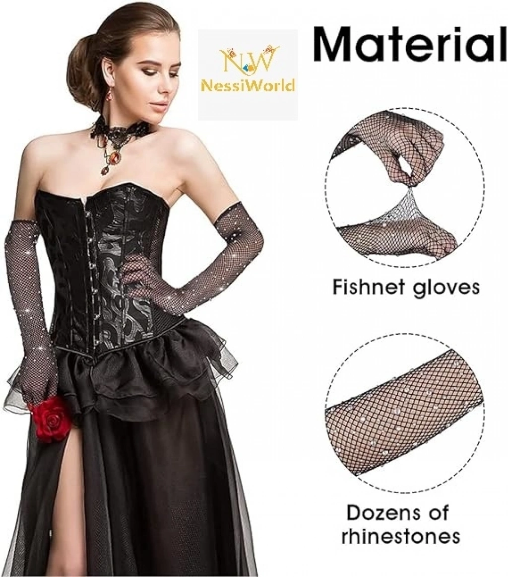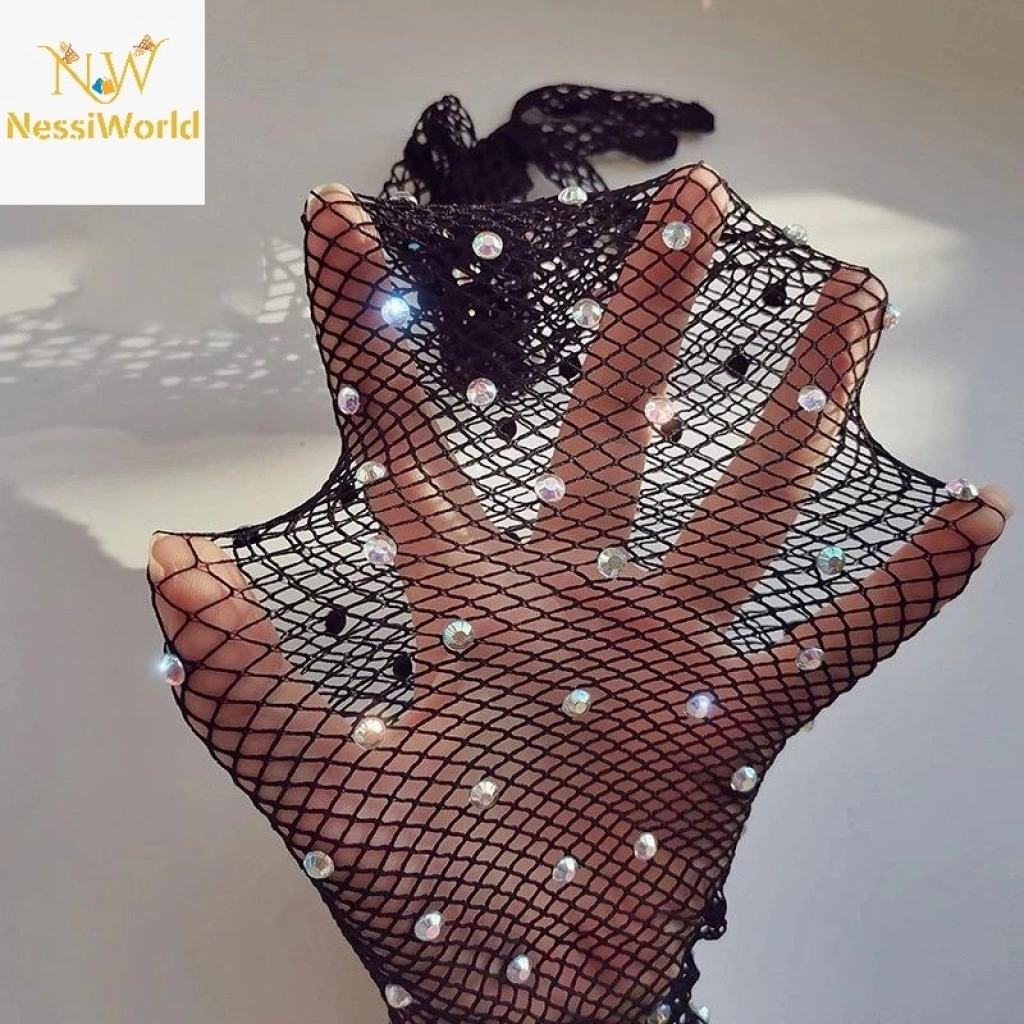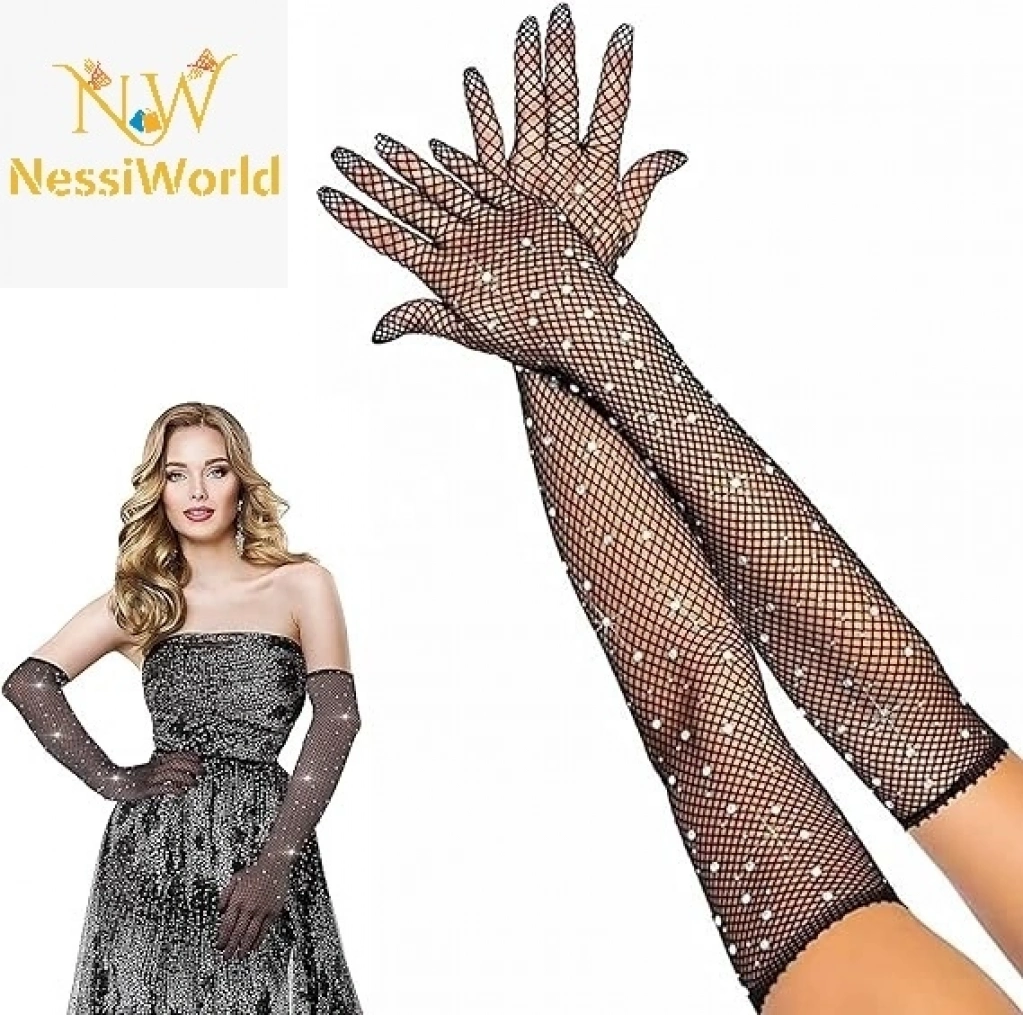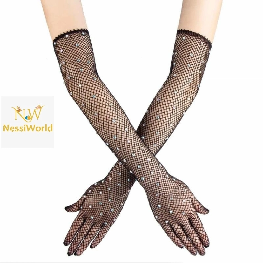 Siyah Renk İncili Elmas İşlemeli File Örgü Uzun Eldiven 45 cm