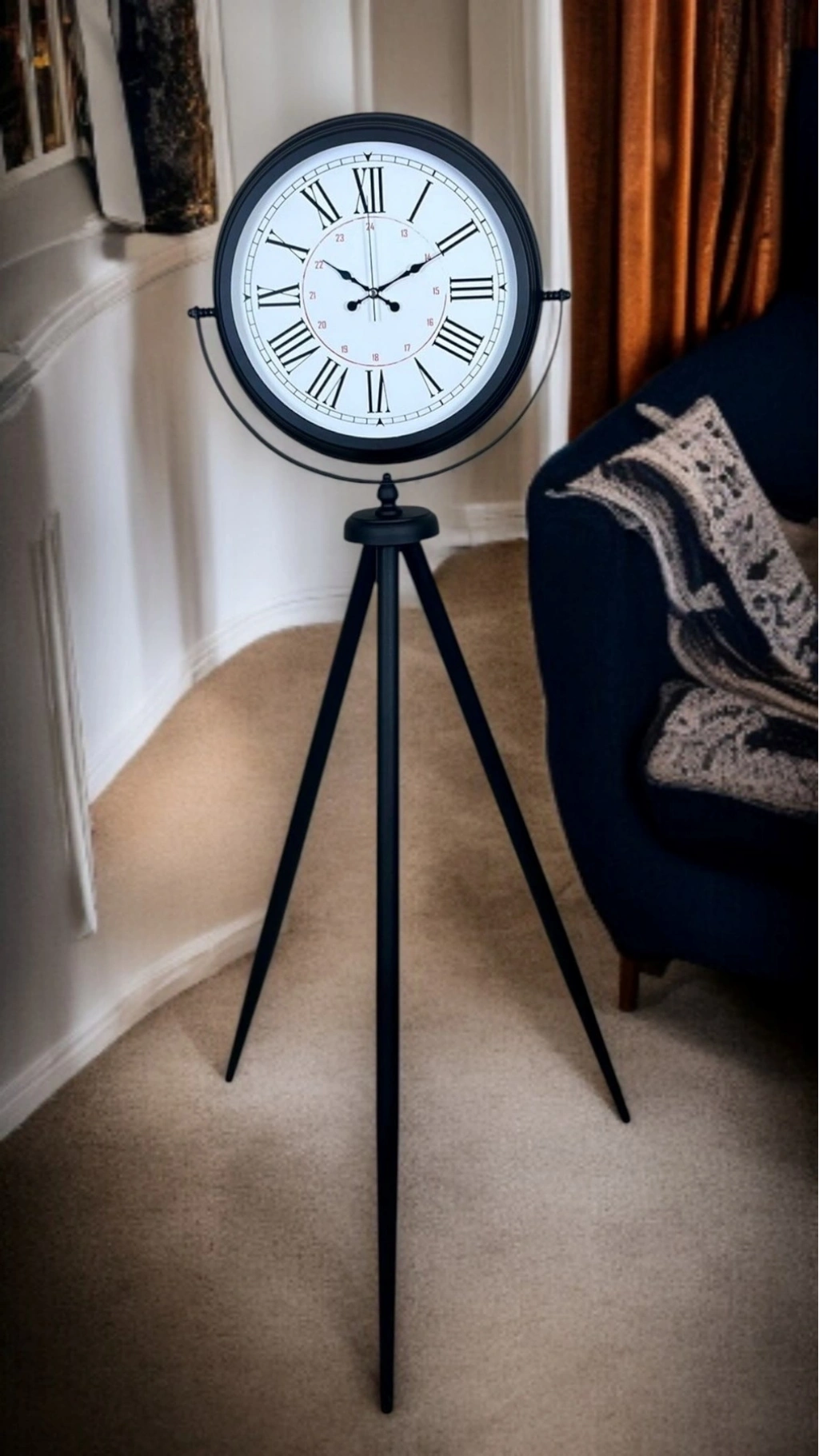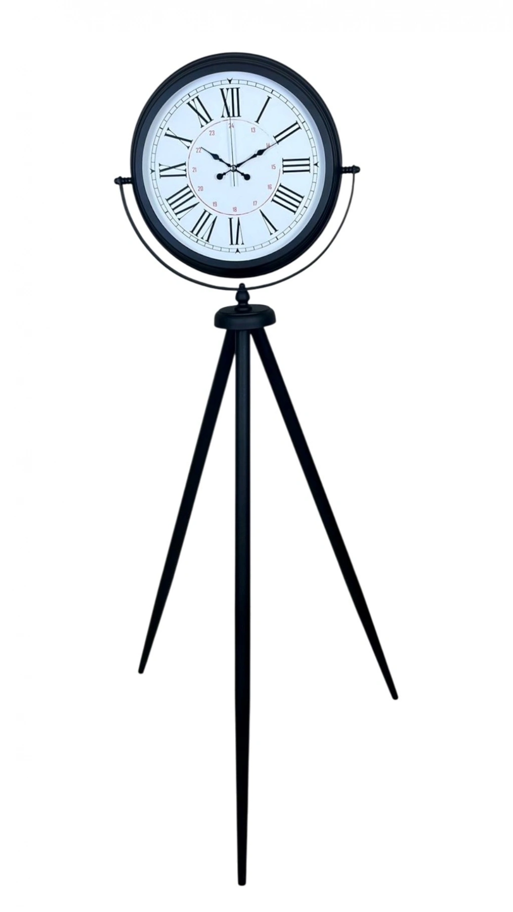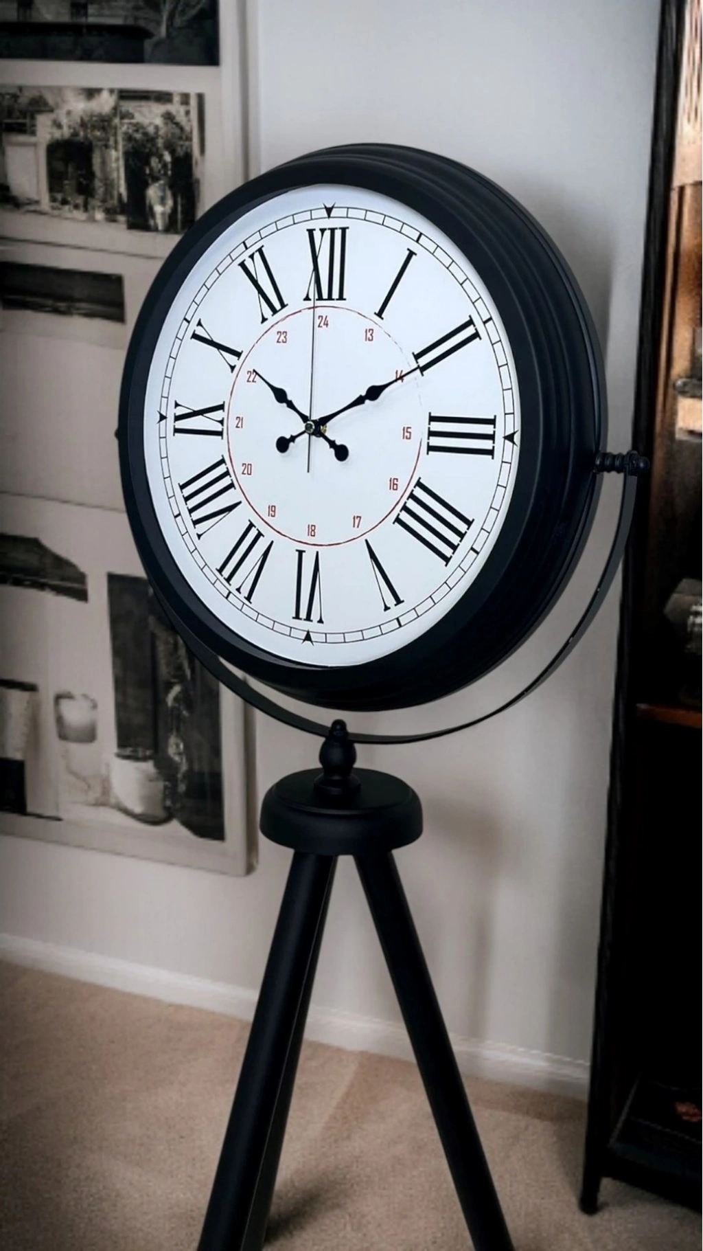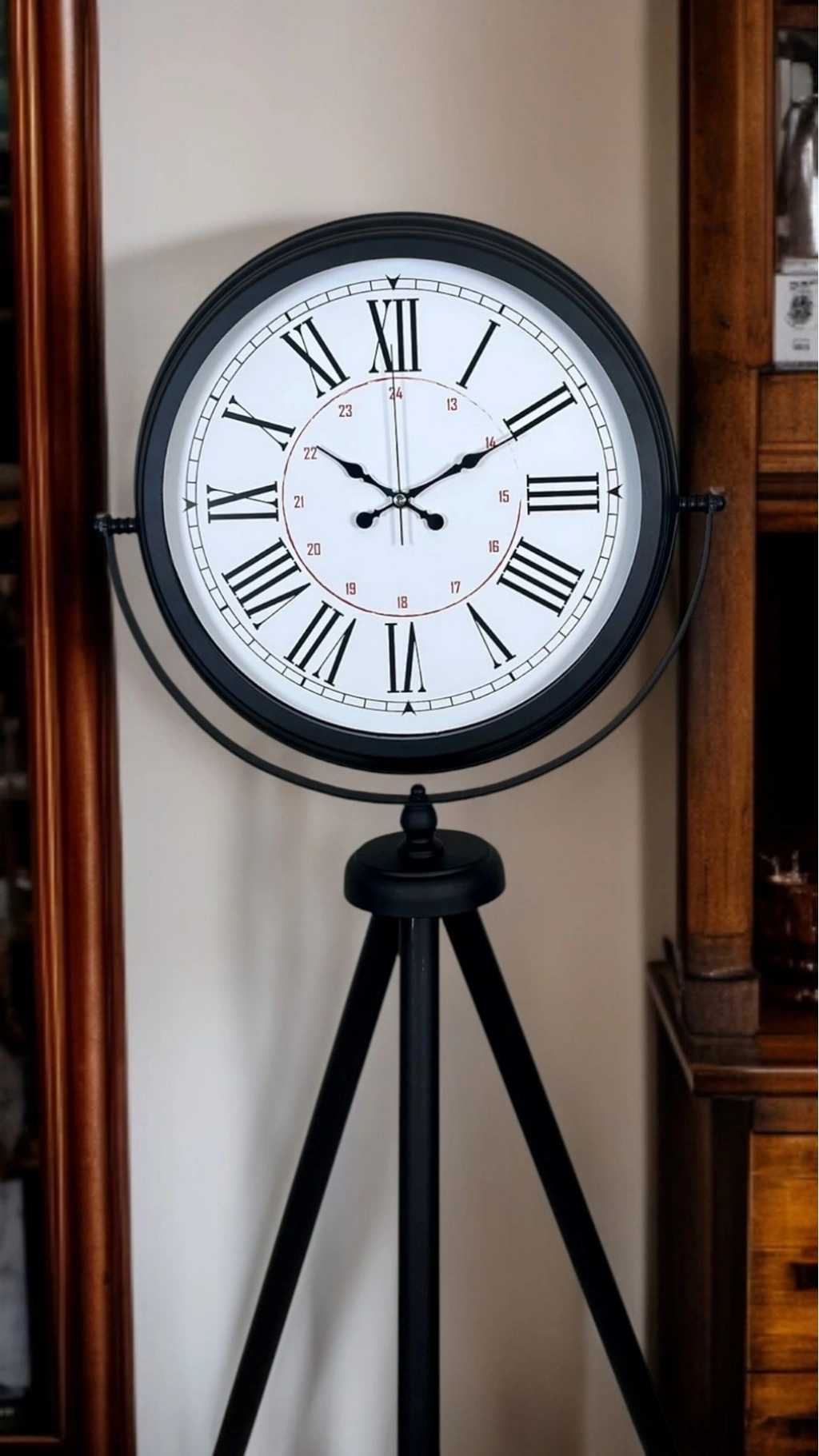 Klasik zarafeti modern tasarımla birleştiren Siyah Tripod Ayaklı Dekoratif Salon Saati, 150 x 45 cm ölçüsüyle bulunduğu alanda güçlü bir duruş sergiler. Siyah metal tripod ayak yapısı, hem modern hem de endüstriyel dekorasyonlara uyum sağlarken; beyaz kadran üzerindeki Roma rakamları saate zamansız ve prestijli bir görünüm kazandırır. Bu modelin öne çıkan detaylarından biri de kadranda yer alan 24 saat göstergesidir. Bu özellik, saati sıradan modellerden ayırarak hem fonksiyonel hem de farklı bir tasarım dokunuşu sunar.
