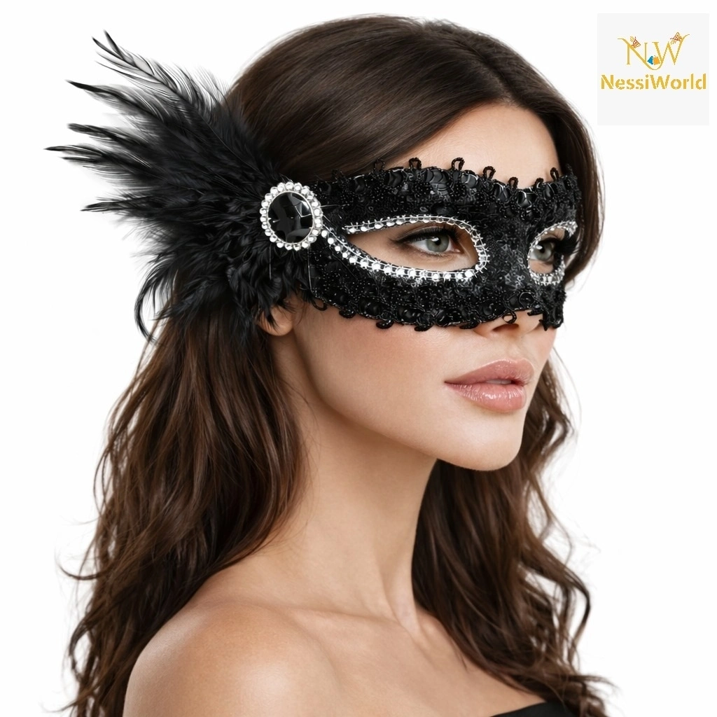 ® Siyah Taşlı Venedik Parti Maskesi – Tüylü Payetli