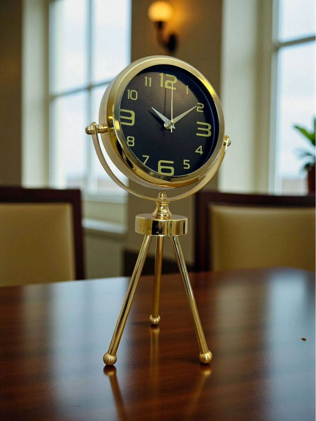 Üç ayaklı tripod yapısı, saatin dekoratif şıklığını artırırken aynı zamanda dengeli ve sağlam bir duruş sağlar. Gold metal yüzey, ışıkla birleştiğinde mekâna lüks bir atmosfer katar. Hem işlevsel bir masa saati hem de dekoratif bir obje olarak dikkat çeker.