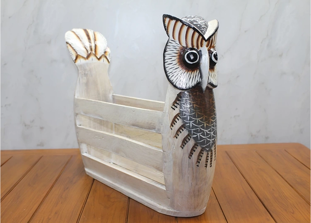 AHŞAP BAYKUŞ GAZETELİKÜrün ÖzellikleriDoğal ahşaptan üretilen baykuş figürlü gazetelik, 33x43 cm boyutundadır. Estetik ve dekoratif tasarımıyla gazete, dergi ve kitaplarınızı düzenli bir şekilde saklamanızı sağlar. El işçiliğiyle özenle hazırlanmış olan bu ürün, ev ve ofis dekorasyonuna şık bir dokunuş katar. Ahşap dokusu sayesinde uzun ömürlü ve dayanıklı bir kullanım sunar.Paket İçeriği1 adet ahşap baykuş gazetelik.