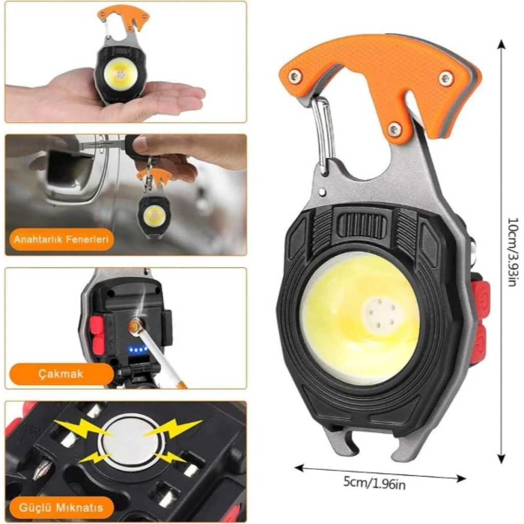 ÇOK FONKSİYONLU ANAHTARLIK KAMP LAMBASIÜrün ÖzellikleriÇok fonksiyonlu anahtarlık kamp lambası, kompakt yapısına rağmen sunduğu zengin özellikleriyle kamp, outdoor, acil durum ve günlük kullanım için ideal bir aydınlatma çözümüdür. Güçlü LED teknolojisi sayesinde yüksek parlaklık sunan bu ürün, 500 lümen güçlü ışık kapasitesi ile karanlık ortamlarda etkili görüş sağlar. Sahip olduğu 6 farklı ışık modu, farklı ihtiyaçlara göre ayarlanabilir aydınlatma imkânı sunarak kamp alanında, araç içinde veya ev kullanımında pratiklik sağlar. Anahtarlık formundaki askılı ve karabineli tasarımı sayesinde çanta, kemer veya anahtar üzerinde kolayca taşınabilir. Dahili çakmak, şişe açacağı, kesici bıçak ve tornavida uçları ile çok yönlü kullanım avantajı sunar. Güçlü mıknatıs özelliği sayesinde metal yüzeylere sabitlenerek eller serbest kullanım sağlar. Type-C bağlantı ile şarj edilebilen yapısı ve şarj göstergeli kamp lambası özelliği, kullanım sırasında enerji durumunu rahatça takip etmenizi sağlar. Su geçirmez gövde yapısı sayesinde zorlu hava koşullarında güvenle kullanılabilir ve outdoor aktivitelerde dayanıklı bir yardımcıdır.Ürün Teknik Özellikleri Özellik Açıklama Ürün Adı Çok Fonksiyonlu Anahtarlık Kamp Lambası Parlaklık 500 lümen Işık Modları 6 farklı aydınlatma modu Şarj Türü Type-C şarj edilebilir Ek Fonksiyonlar Çakmak, şişe açacağı, kesici bıçak, 2 adet tornavida, düdük Mıknatıs Güçlü mıknatıslı yapı Dayanıklılık Su geçirmez gövde Taşıma Anahtarlık ve karabine tasarımı Kullanım Alanı Kamp, outdoor, acil durum, günlük kullanım Paket İçeriği1 adet çok fonksiyonlu anahtarlık kamp lambası