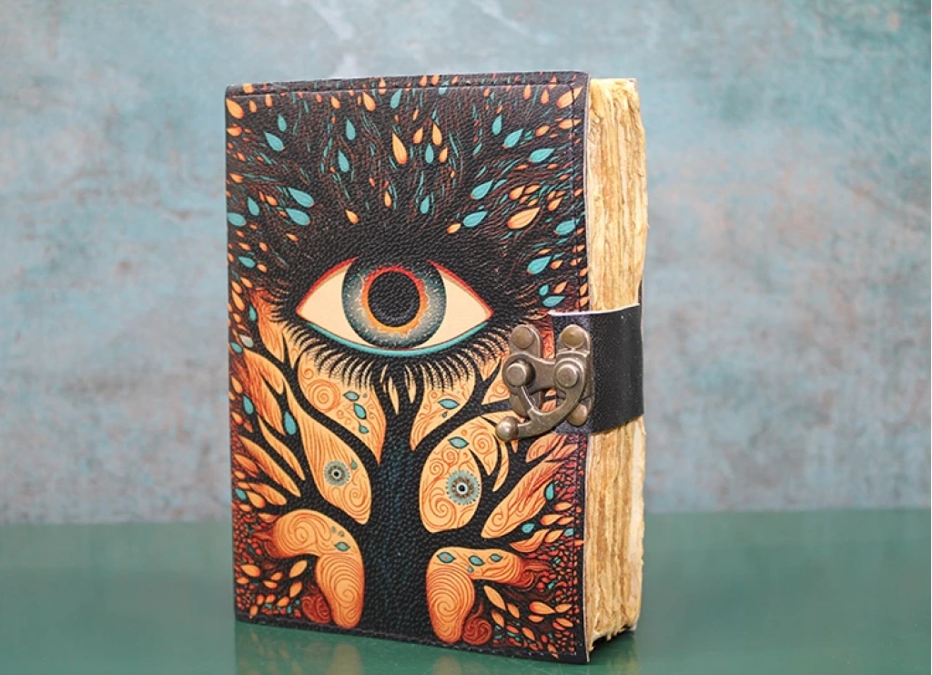 GÖZ TASARIMLI DERİ DEFTERÜrün ÖzellikleriGöz Tasarımlı Deri Defter, göz ve ağaç birleşimiyle yaratılmış eşsiz bir tasarıma sahip olup, estetik ve anlam dolu bir defterdir. Deri kapak üzerine işlenen bu özgün tasarım, doğa ve mistisizmin birleşimini yansıtır. 18x13 cm ölçülerindeki boyutu, günlük kullanım için rahat bir yazı alanı sağlar. Hem kişisel kullanım hem de hediye olarak ideal bir tercihtir. Yüksek kaliteli deri malzeme ile üretilmiş olup, uzun süreli kullanım sunar.Paket İçeriği1 adet Göz Tasarımlı Deri Defter.