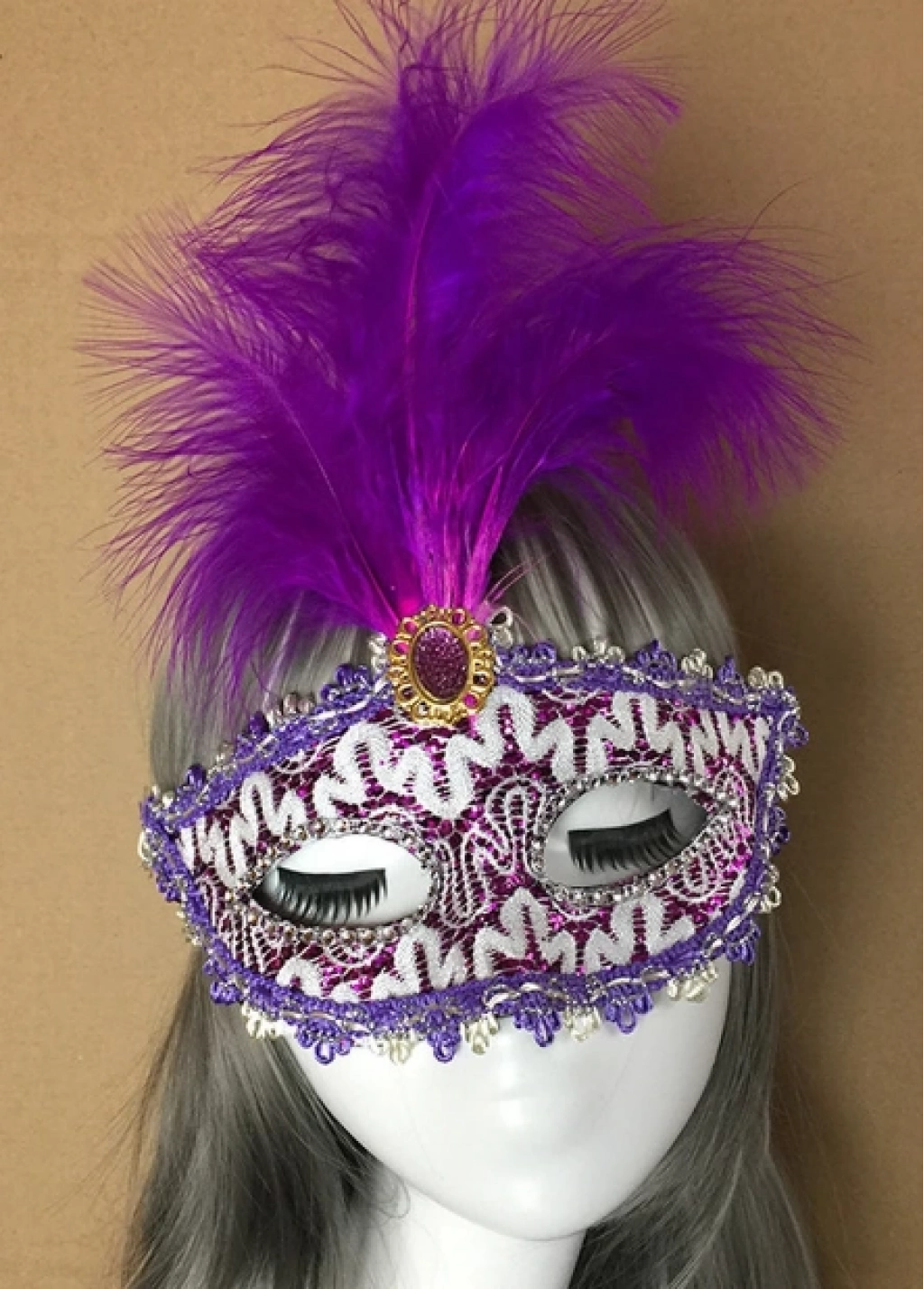 Mor Dantel İşlemeli Mor Tüylü Balo Parti Maskesi