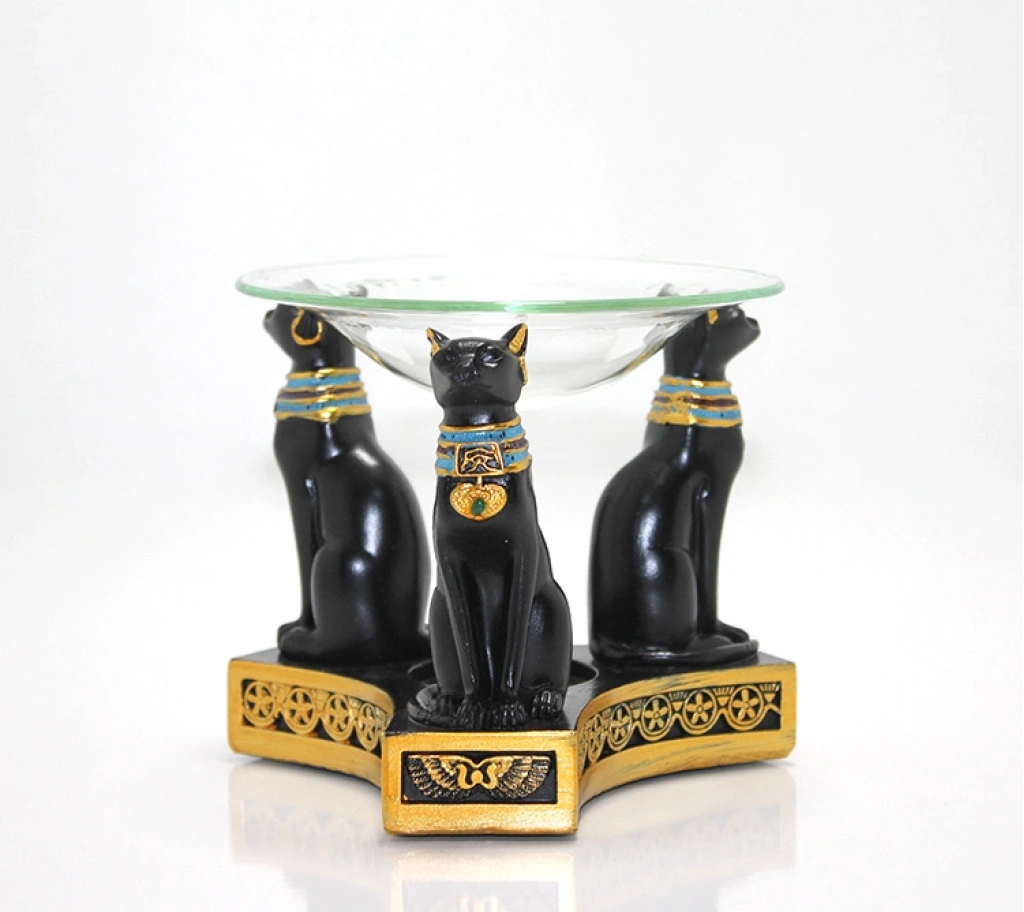 POLYESTER MISIR KEDİSİ BUHURDANLIKÜrün ÖzellikleriPolyester Mısır Kedisi Buhurdanlık, Antik Mısır’ın sembolik kedi figürlerini modern dekorasyonla buluşturan şık bir aromaterapi ürünüdür. 11x12 cm boyutundaki ideal ölçüsü sayesinde hem ev hem de iş yeri ortamlarında kolayca kullanılabilir. Üç adet detaylı Mısır kedisi figürünün taşıdığı cam hazne, ürüne hem estetik hem de mistik bir görünüm kazandırır. 1.derece kaliteli polyesterden üretilmiş olması sayesinde uzun ömürlü, sağlam ve ısıya dayanıklı bir kullanım sunar. Üst kısımda yer alan cam bölmeye uçucu yağ, esans yağı veya kokulu mum yağı eklenerek ortamda hoş ve kalıcı bir aroma yayılması sağlanır. Alt bölmeye yerleştirilen tealight mum ile birlikte kısa sürede verimli bir aromaterapi etkisi oluşturur. Etnik dekor sevenler, fark yaratan biblo tarzı buhurdanlık arayanlar ve yaşam alanına mistik bir dokunuş katmak isteyenler için ideal bir seçimdir.Paket İçeriği1 adet Polyester Mısır Kedisi Buhurdanlık