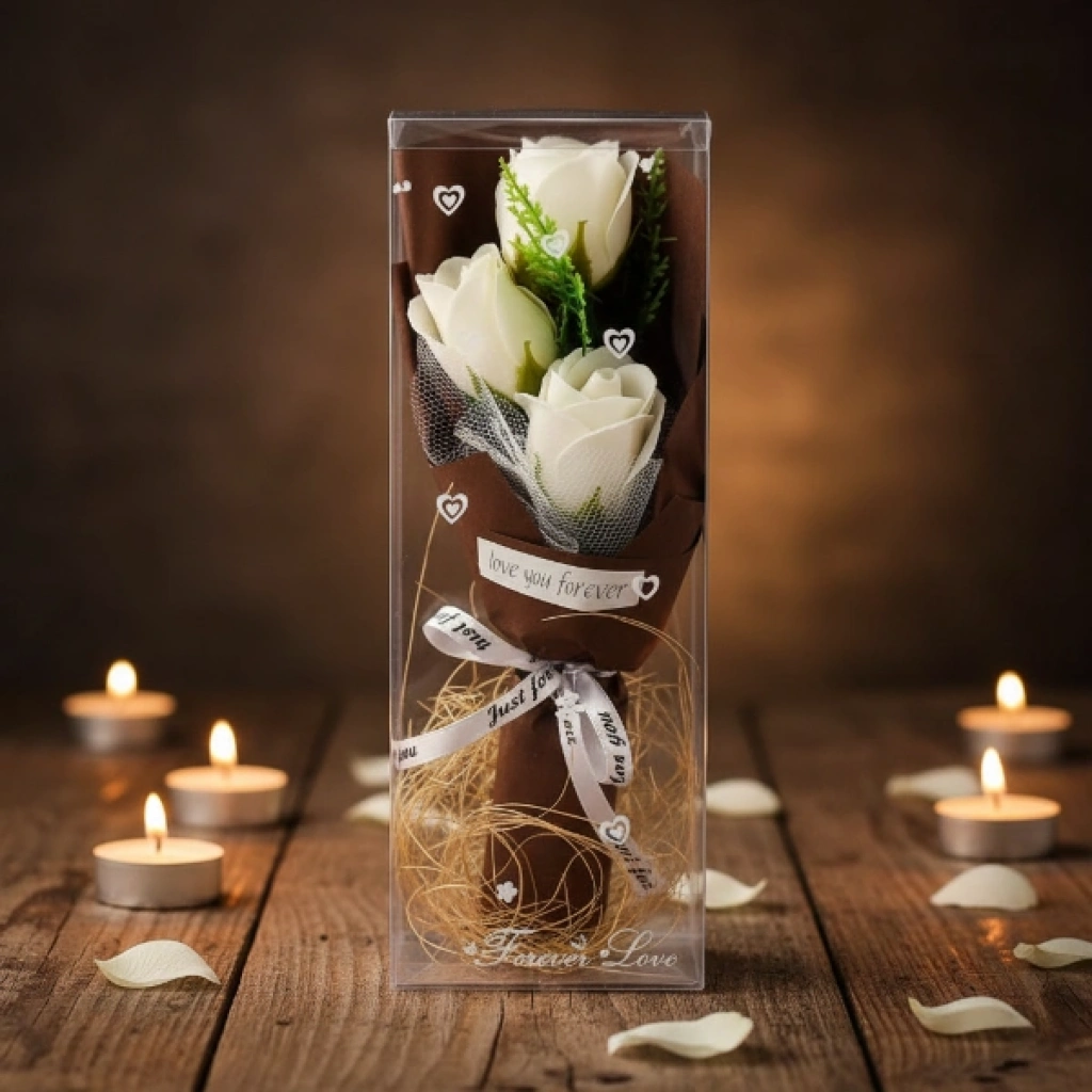 ŞEFFAF KUTULU ÜÇ GÜL BUKETİÜrün ÖzellikleriŞeffaf kutulu üç gül buketi, zarif ve romantik tasarımıyla özel günlerde anlamlı bir hediye alternatifi sunar. Şeffaf koruyucu kutu içerisinde sunulan üçlü gül aranjmanı, hem estetik bir görünüm sağlar hem de ürünün formunu uzun süre korumasına yardımcı olur. Minimal ve şık tasarımı sayesinde masa, komodin ve vitrin dekorasyonunda rahatlıkla sergilenebilir. Üçlü gül buketi tasarımı, sevgi ve zarafeti simgeleyen klasik bir hediye seçeneğidir. Özel günlerde, doğum günü, yıl dönümü veya sürpriz hediyelerde tercih edilebilen şeffaf kutulu gül buketi, dekoratif yapısı ile kalıcı bir hatıra niteliği taşır. Renk seçimi yapılamaz, ürün görseldeki renklerden biri karışık olarak gönderilir. Dekoratif gül aranjmanı, hem romantik hem de şık bir sunum arayanlar için ideal bir tercihtir.Ürün Teknik Özellikleri Özellik Açıklama Ürün Adı Şeffaf Kutulu Üç Gül Buketi Malzeme Dekoratif yapay gül ve şeffaf kutu Renk Görseldeki renklerden biri, karışık gönderim Kullanım Alanı Hediye ve dekoratif süs Paket İçeriği1 adet şeffaf kutulu üç gül buketi (renkler karışık gönderilir)