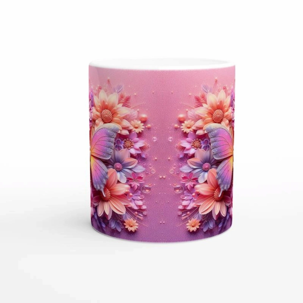 Işıltılı Çiçekler Arasında Renkli Kelebek Temalı Baskılı Kupa Bardak, ışıltılı pembe arka planı ve detaylı çiçek desenleriyle iç ısıtan bir atmosfer sunuyor. Doğanın büyüsünü yaşam alanına taşımak isteyenler için eşsiz bir tercih.