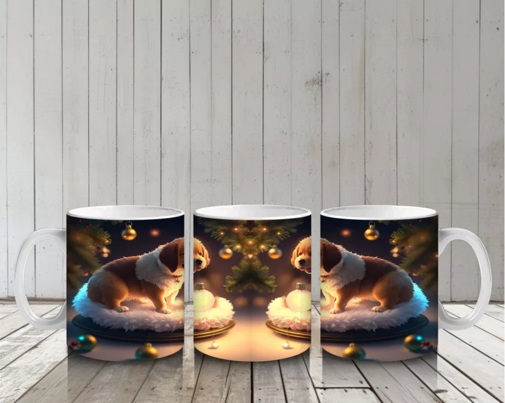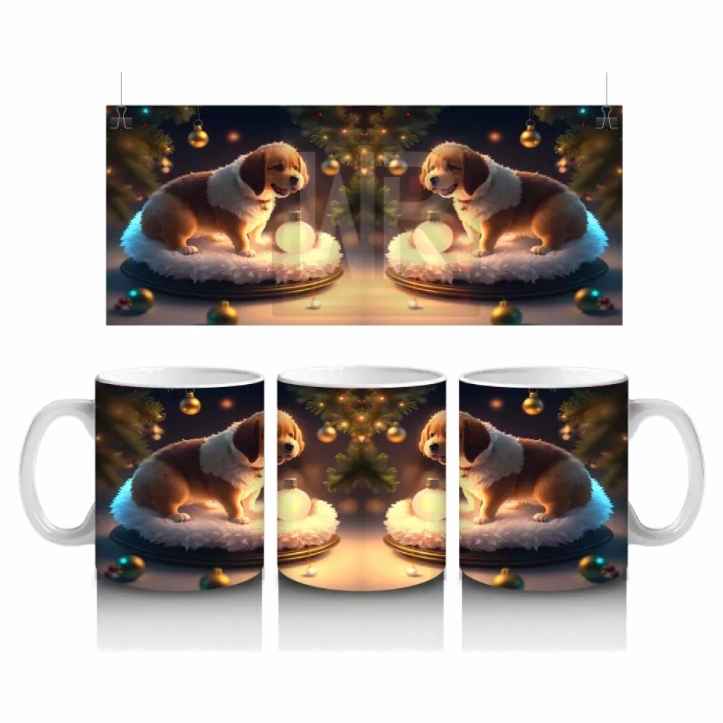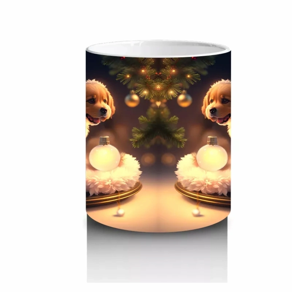 Işıltılı mumlar eşliğinde poz veren yavru köpek, sıcak ve samimi bir görünüm sunuyor. Romantik ve neşeli detayları sevenler için ideal bir kupa.