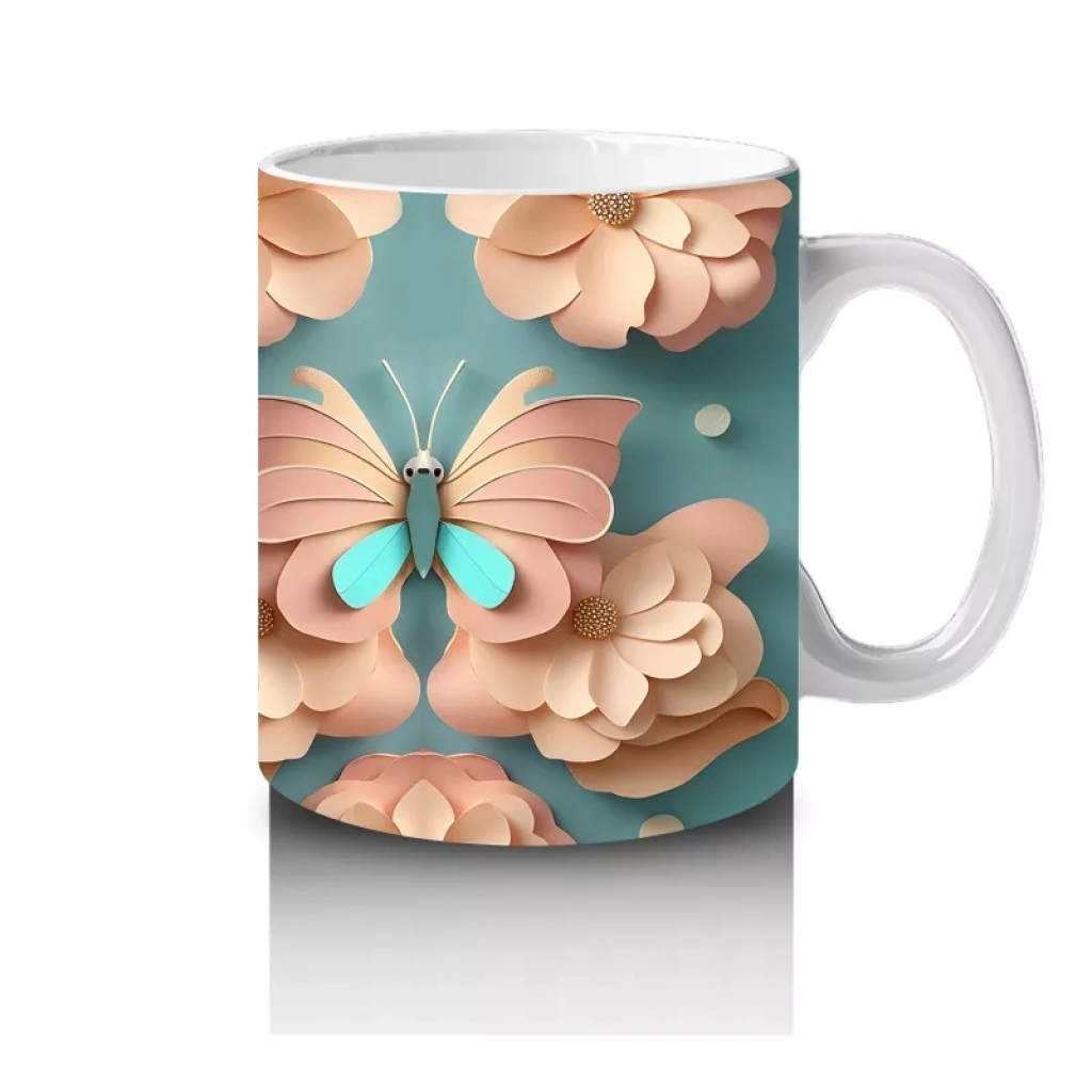 Pastel renklerde dönüşümlü kelebek figürleri, yumuşak ve huzur verici bir atmosfer yaratıyor. Romantik ve estetik detayları sevenler için zarif bir kupa seçeneği.