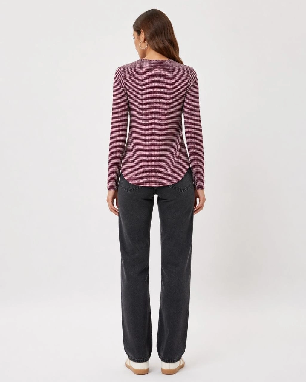 Kadın Dokulu Çizgili Uzun Kollu Tişört Oval Kesim Basic Rahat Kalıp Bluz - Bordo