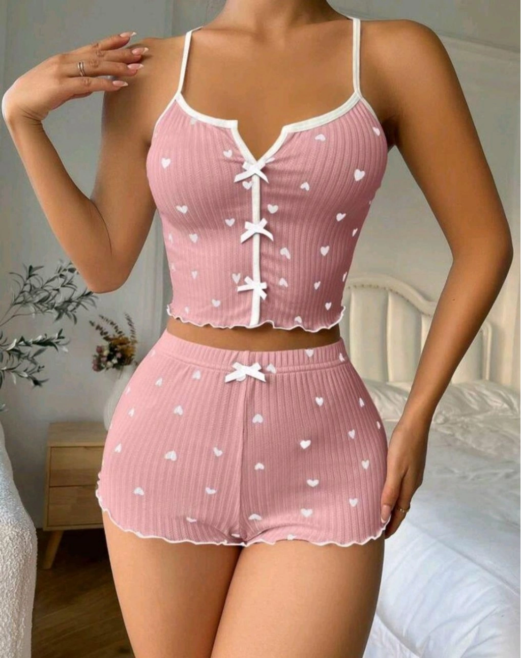 Pembe kalpli askılı şortlu pijama takımı, romantik ve feminen bir stil yaratır. Hafif kumaşı ile rahat kullanım sunar.