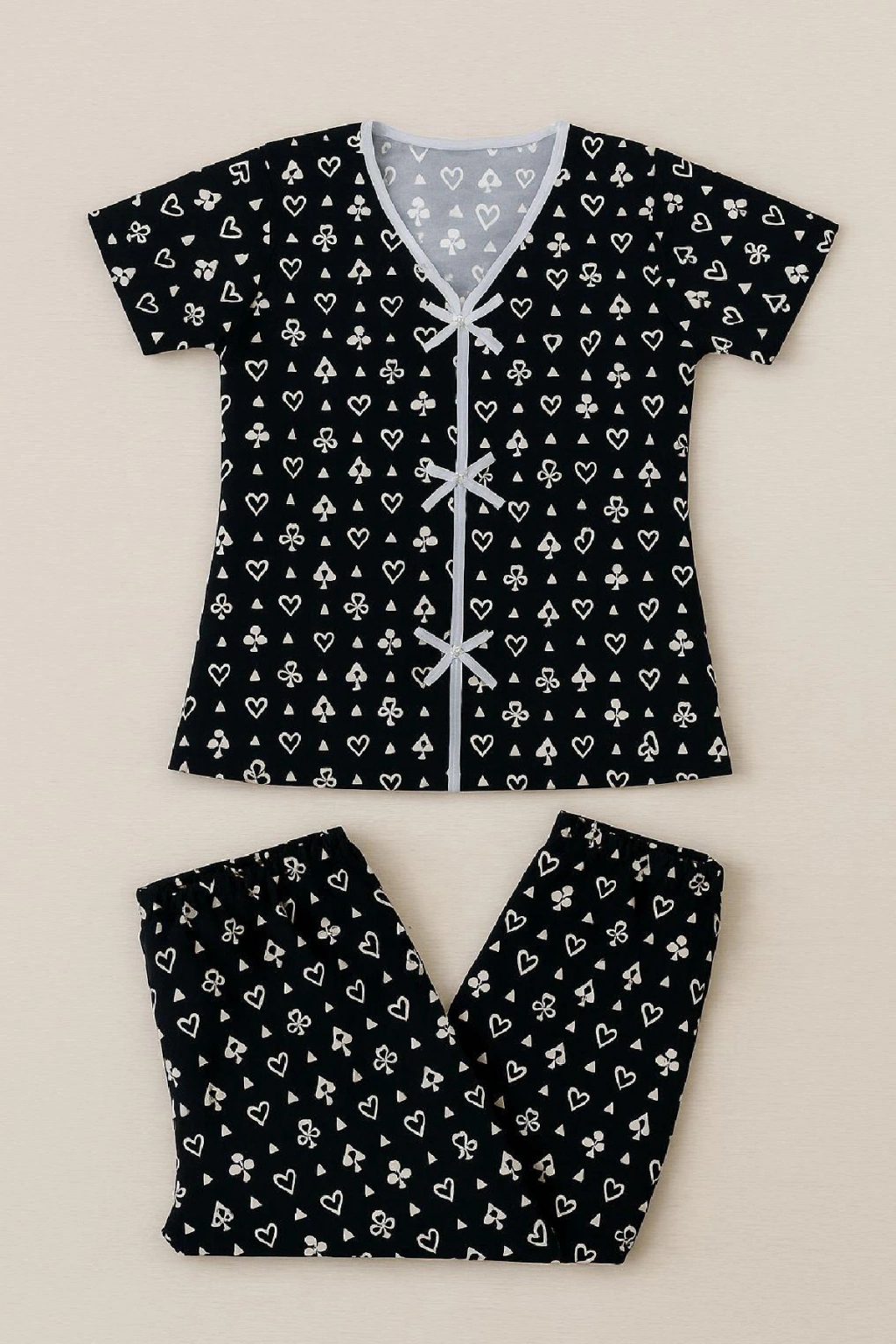 Kadın Siyah Beyaz Kalp Desenli Fiyonklu Kısa Kollu Pijama Takımı