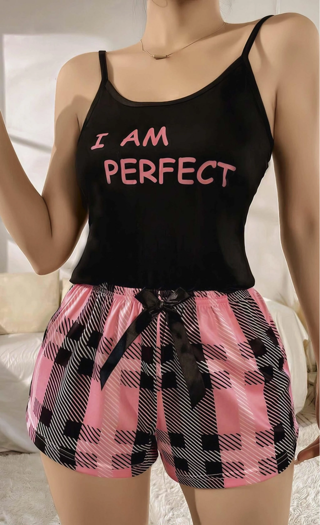 Siyah kare desenli askılı şortlu pijama takımı, minimalist tasarımıyla öne çıkar. Yumuşak dokusu sayesinde hem uyku hem de evde dinlenme anları için idealdir.