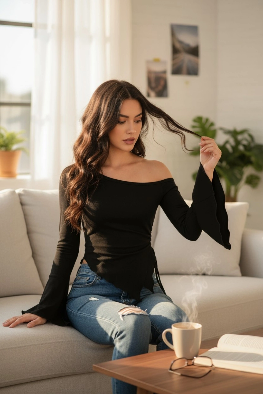 • Modern çizgilerle tasarlanmış Kadın Siyah Asimetrik Yaka Drapeli Yan Bağlamalı Uzun Kollu Bluz, sade ama etkileyici tarzıyla dikkat çeken bir parça.