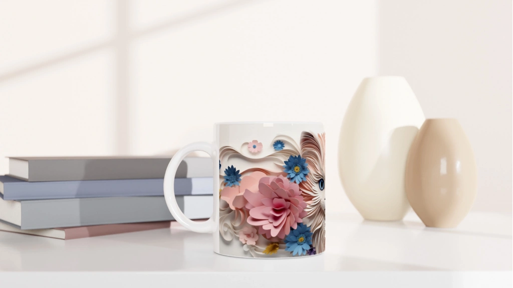 Kağıt Çiçeklerle Süslenmiş Mavi Gözlü Kedi Baskılı Kupa Bardak, çiçek sanatının ve kediseverlerin buluşma noktası olan özel bir parça.