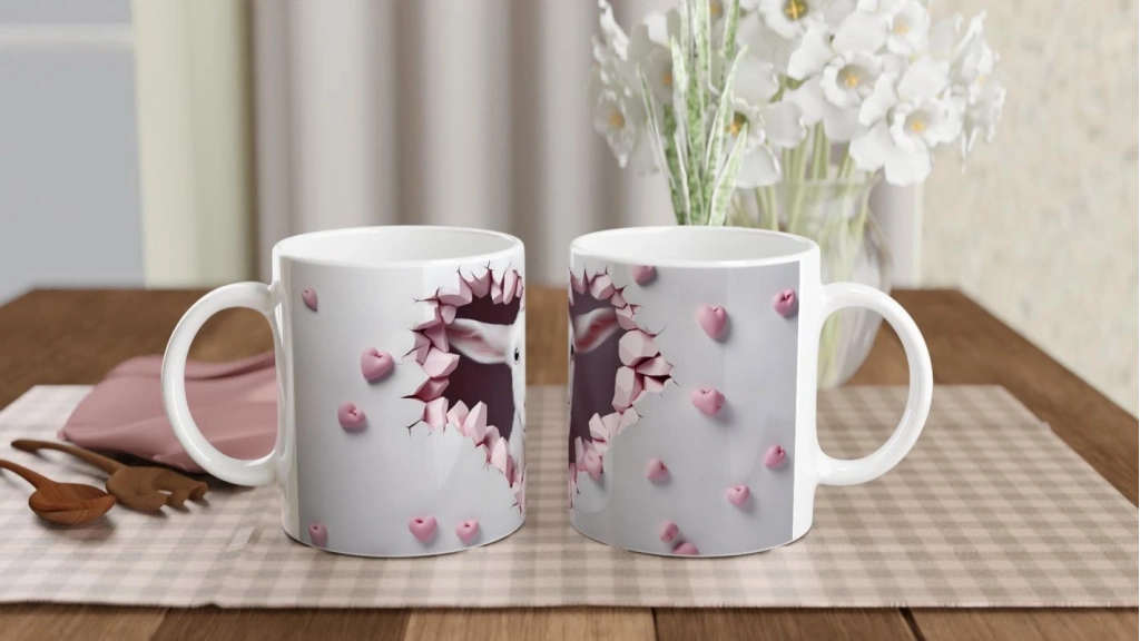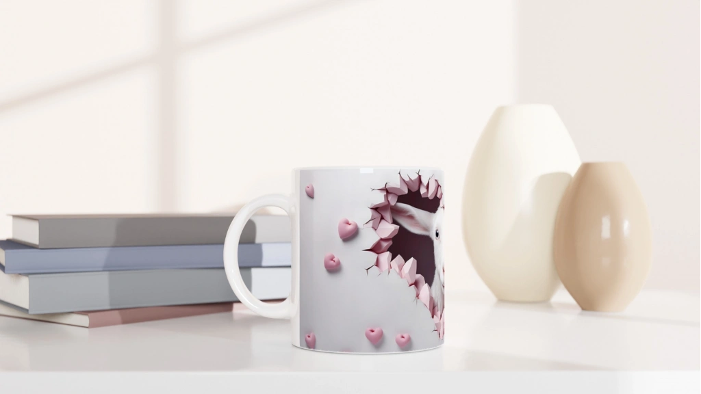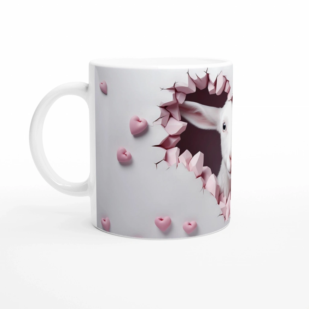 Kalp şeklinde çatlamış yüzeyin ardından bakan beyaz keçi figürü, pastel pembe tonlarındaki sevimli kalp detaylarıyla birleşerek sıcak içecek keyfinizi özel kılar.