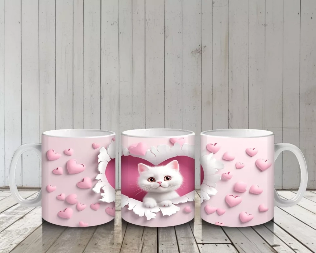 Kalp desenli arka planla tamamlanan beyaz kedinin zarafeti bu kupada hayat buluyor! ?? Kedi severler için mükemmel bir sevgi temalı hediye.