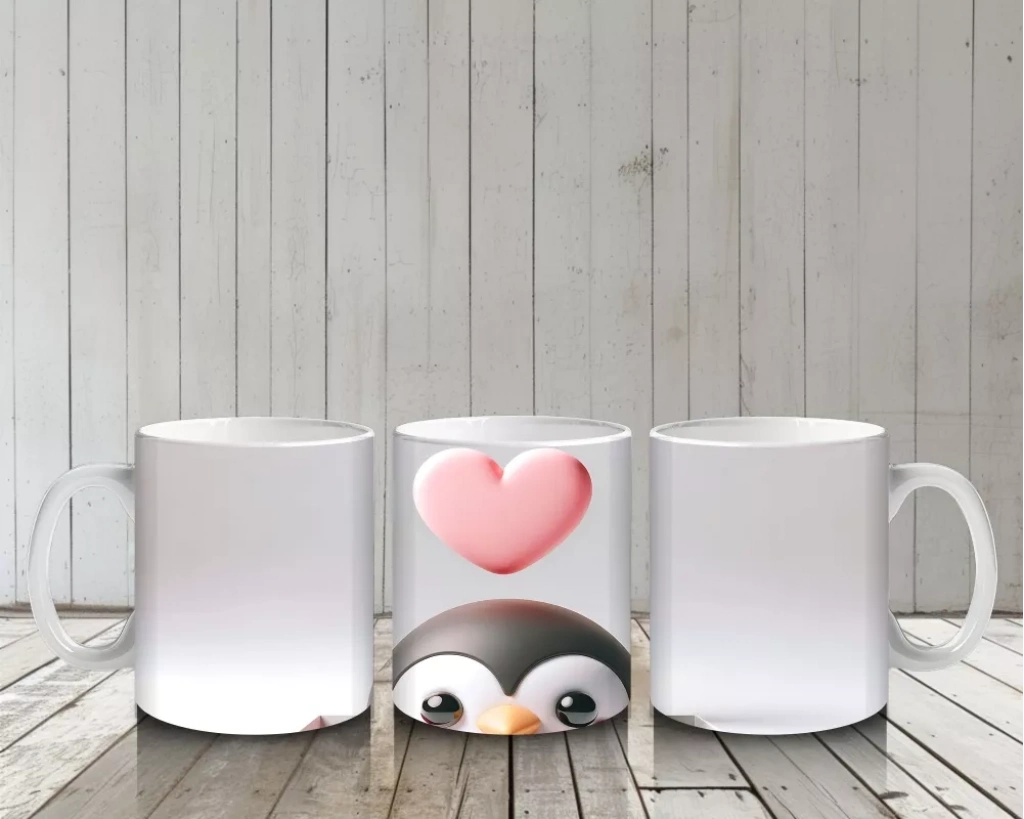 Kalp Figürlü Arka Plan Üzerinde Sevimli Penguen Yüzü – Baskılı Kahve Kupası