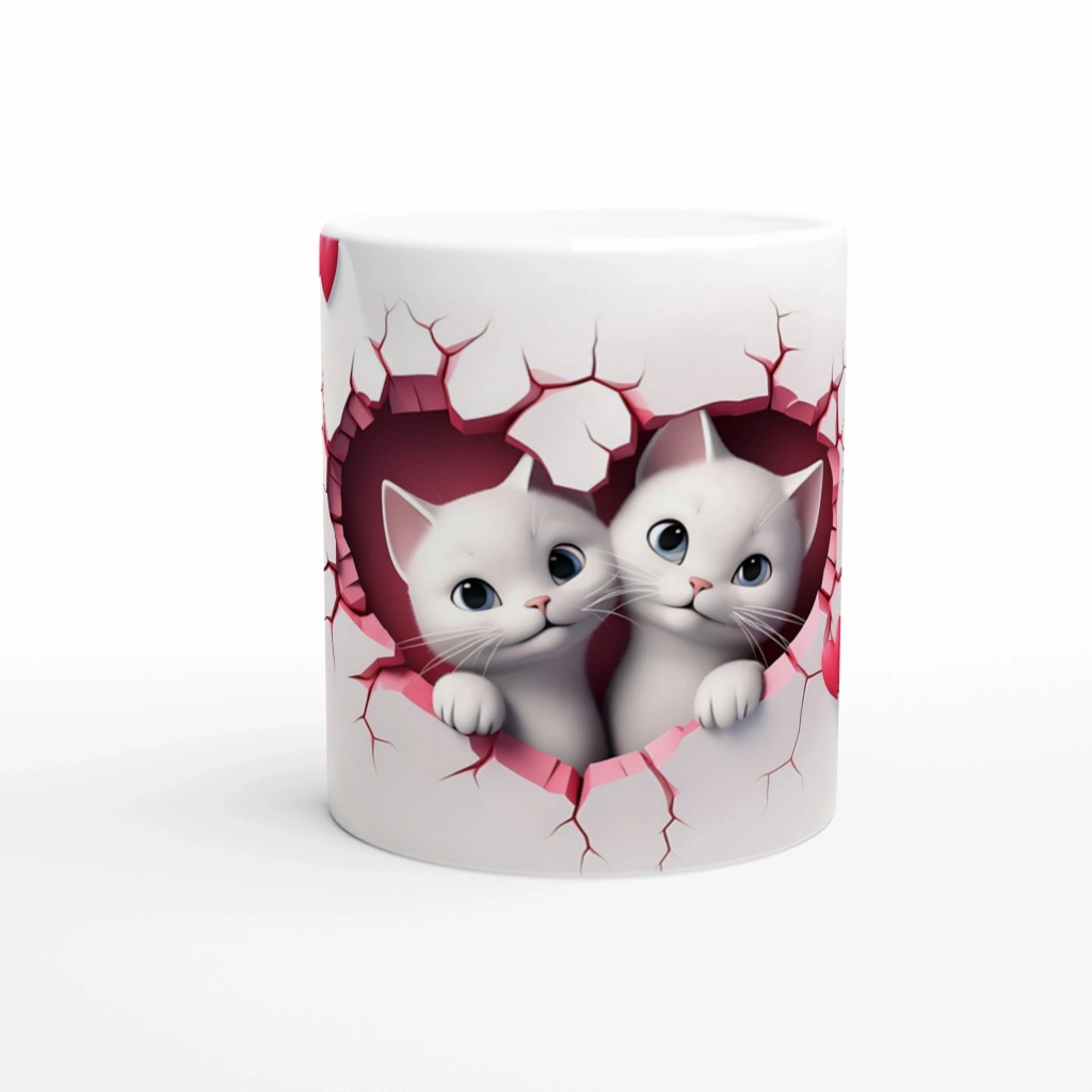 Kalp Şeklinde Çatlağın İçinden Bakan İkiz Kediler Temalı Baskılı Kupa Bardak, beyaz zemin üzerindeki pembe çatlaklarla kalp formunda şekillenmiş aralıktan sevimli ikiz kedilerin bakışıyla aşk dolu bir tasarım sunar. Gülümseten detaylarıyla hediye alternatifi olarak da öne çıkar.