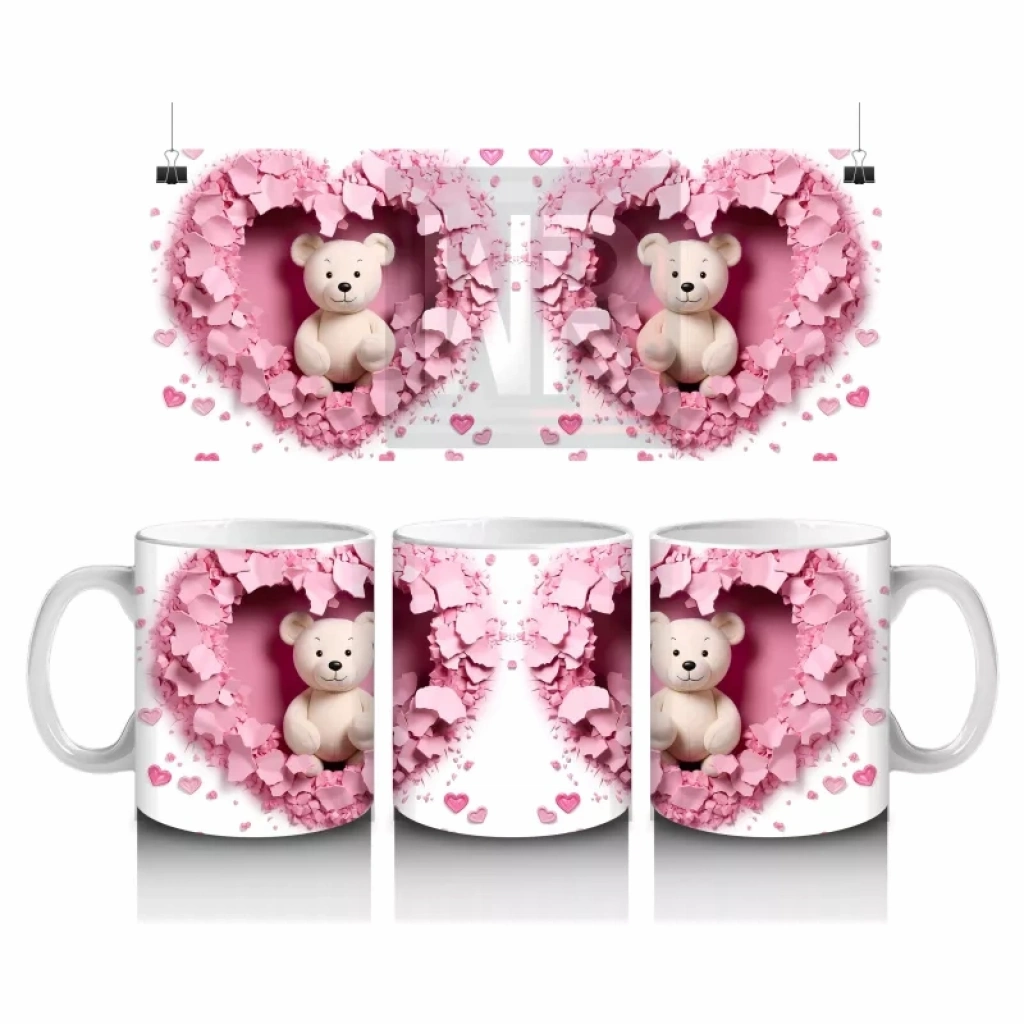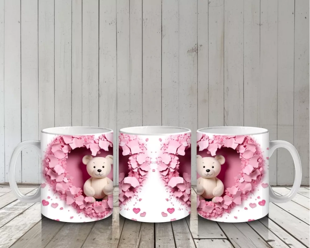 Kalp Şeklinde Pembe Arka Planda Ayıcık Çifti – Baskılı Kahve Kupası