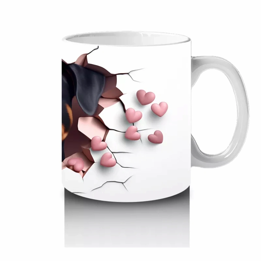 Kalplerle çevrili ve neşeyle gülümseyen Doberman, sevgi dolu ve samimi bir atmosfer yaratıyor. Pozitif ve sıcak detayları sevenler için özel bir tasarım.