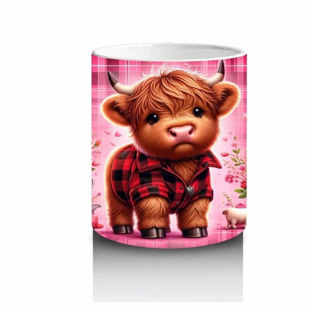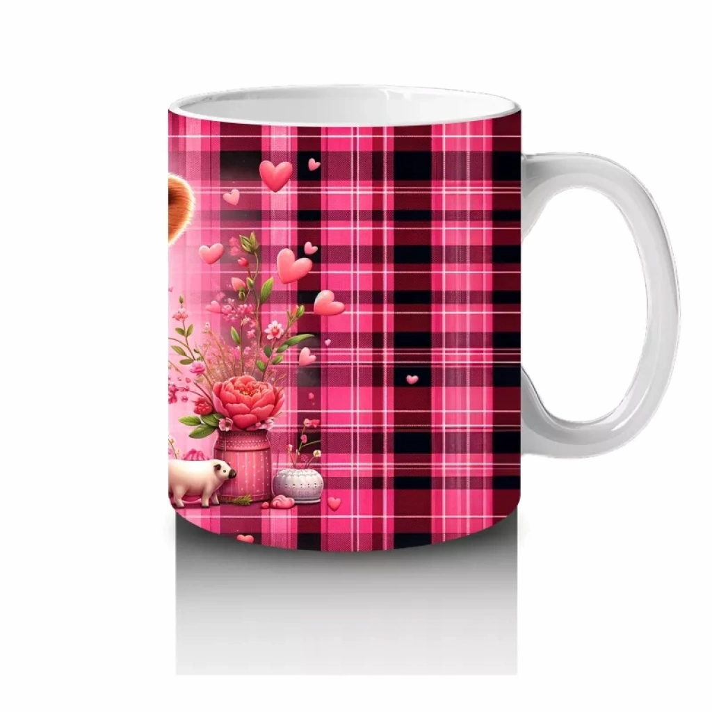 Kareli arka plan ve etrafını saran kalplerle bu tatlı buzağı figürü, sevimliliğiyle kalpleri fethediyor. Neşeli ve romantik tasarımları sevenler için sıcak bir kupa seçeneği.