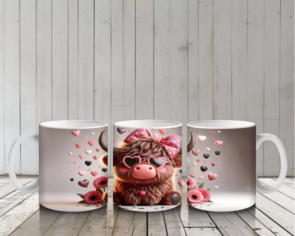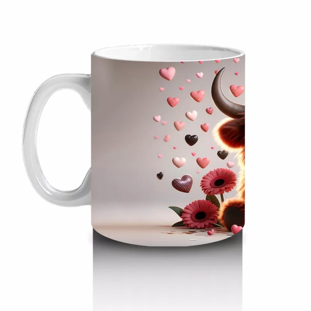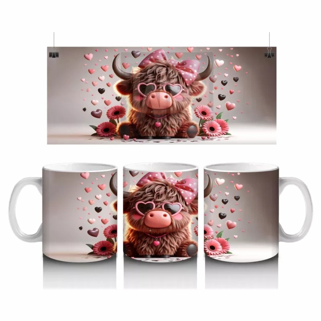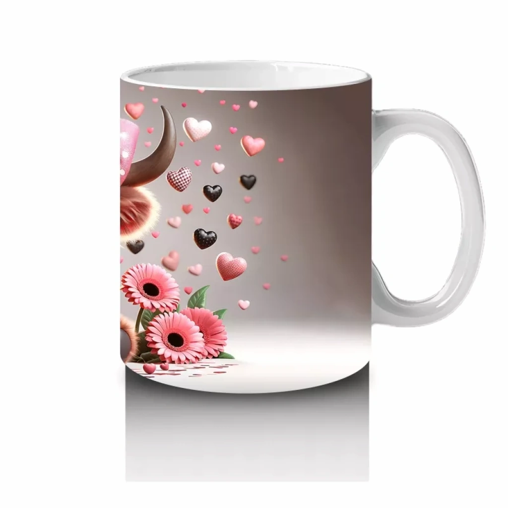 Kalplerle Süslenmiş Sevimli Pembe Kornalı Buzağı – Baskılı Kahve Kupası