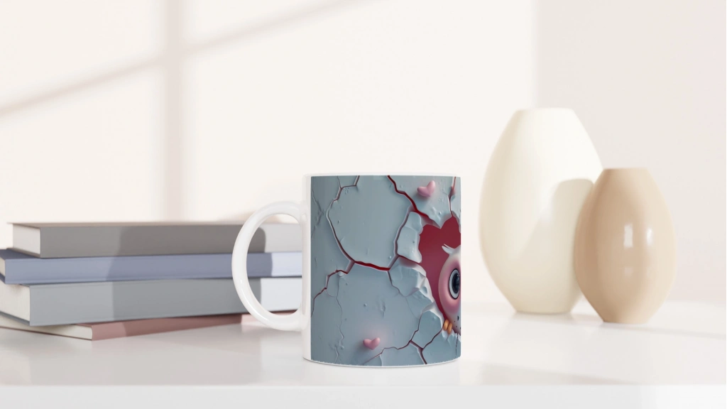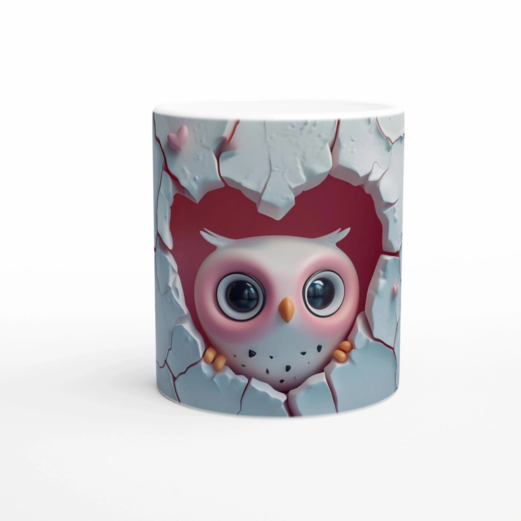Kalpli Çatlağın Ardından Bakan Baykuş Temalı Baskılı Kupa Bardak, beyaz çatlak zemin üzerinde beliren kalp şeklindeki boşluk ve içinden bakan tatlı baykuş figürüyle hem romantik hem eğlenceli bir atmosfer sunar. Özellikle sevgi temalı hediyeler için ideal bir tasarım.
