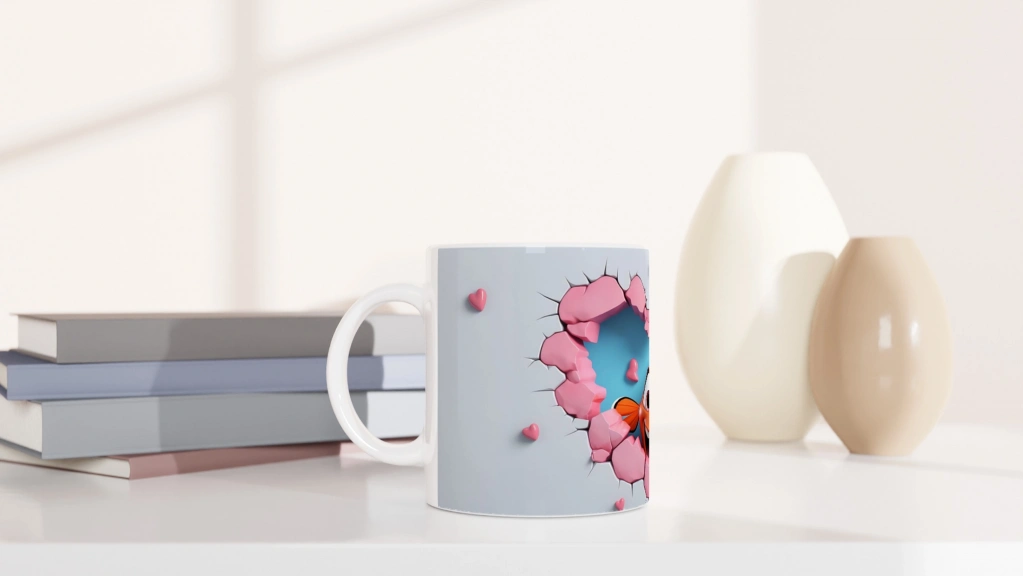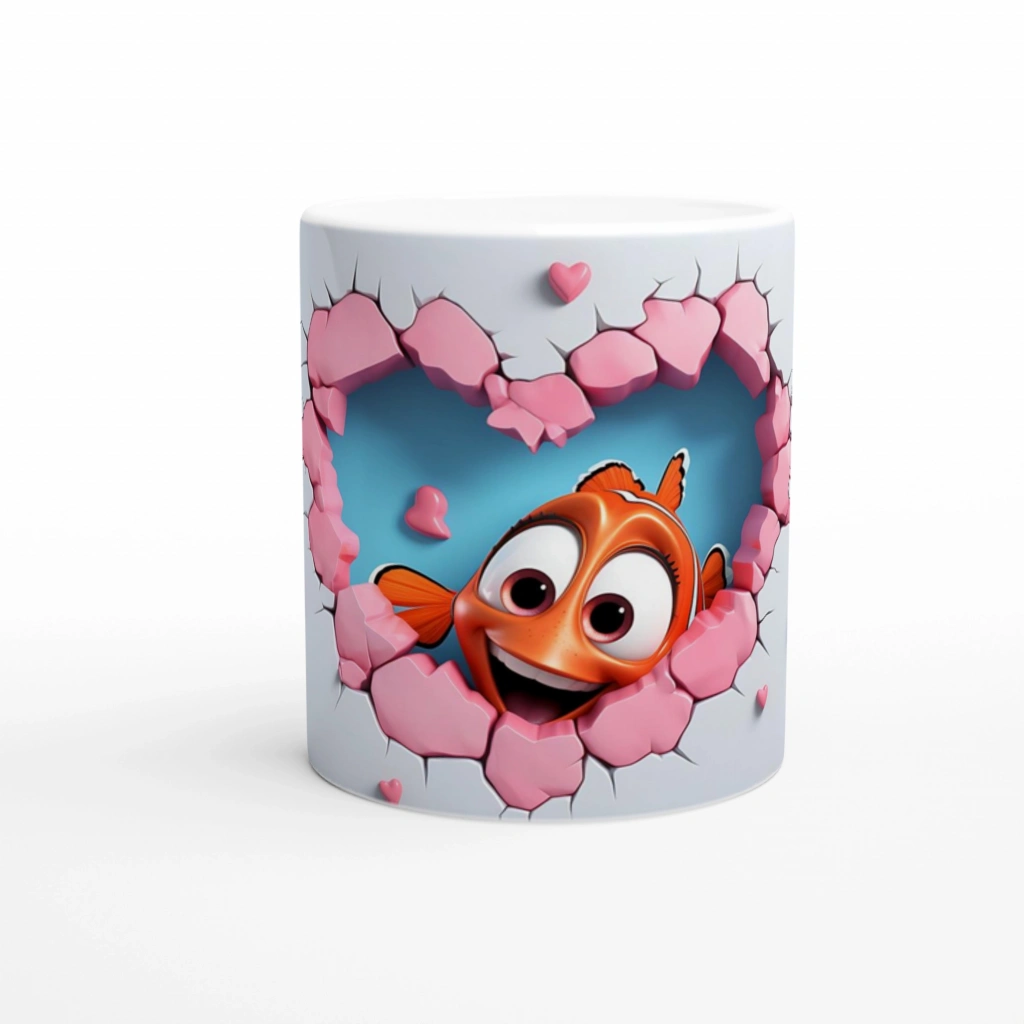 Kalpli Çatlağın Ardından Bakan Palyaço Balığı Temalı Baskılı Kupa Bardak, mavi fon önünde pembe kalp desenli çatlaklardan çıkan sevimli balık illüstrasyonuyla hem deniz temasını hem sevgiyi bir araya getiriyor. Renkli ve eğlenceli bir hediye alternatifi.