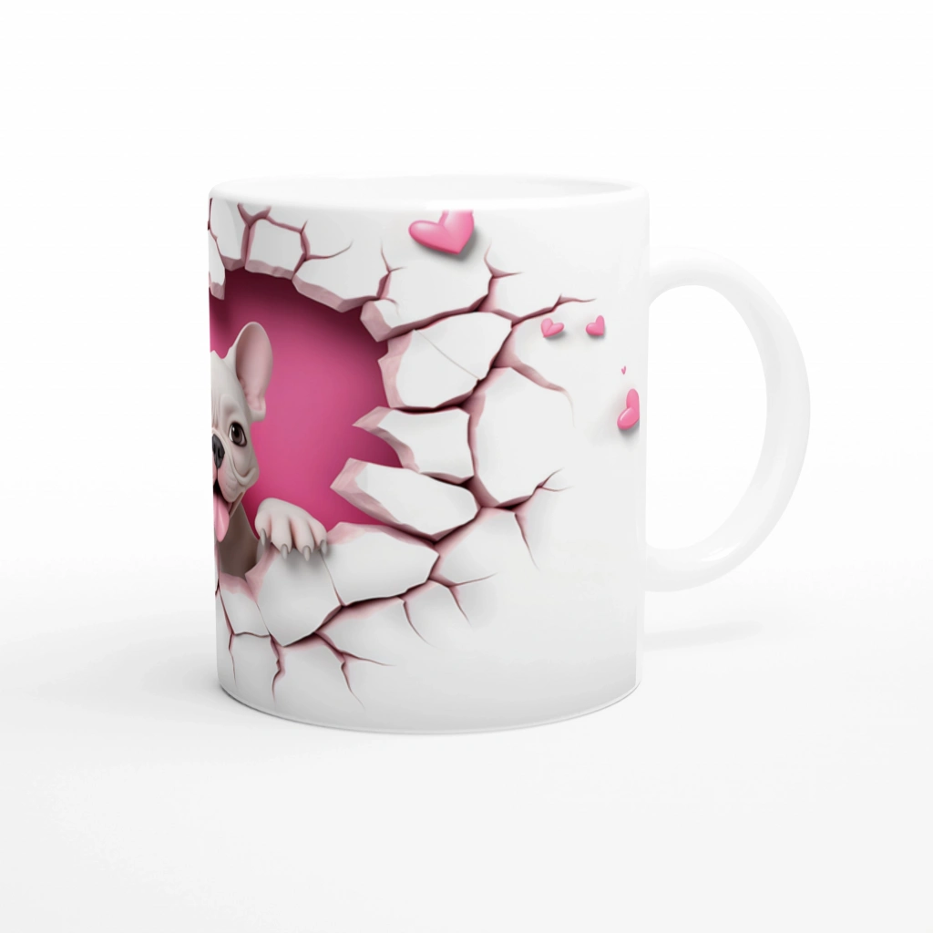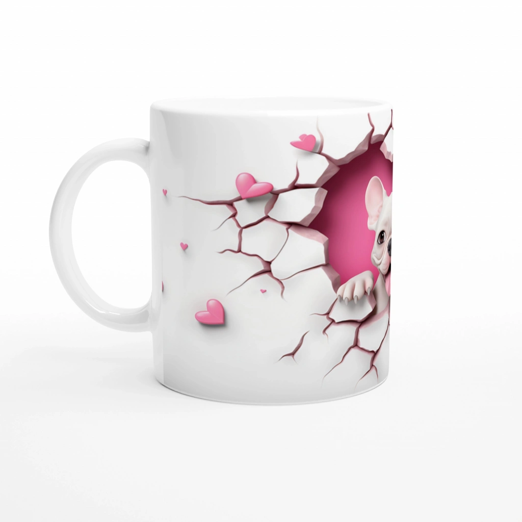 Kalpli Çatlak Duvardan Bakan Fransız Bulldog Temalı Baskılı Kupa Bardak, pembe kalplerle süslenmiş arka planı ve sevimli köpeğin tatlı dili dışarıda pozu ile dikkat çekiyor. Her yudumda sıcaklık ve mutluluk hissi yaşatmak isteyenlere özel tasarlandı.