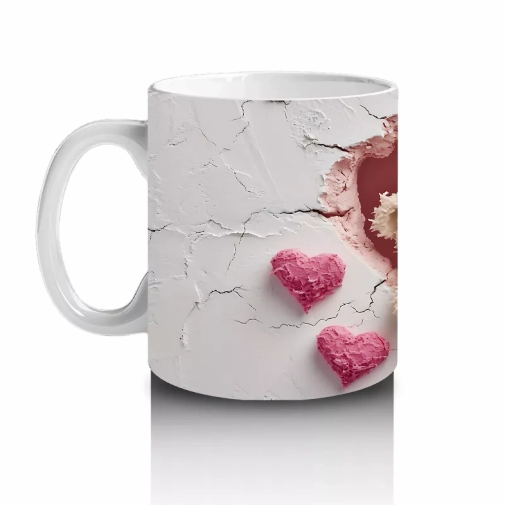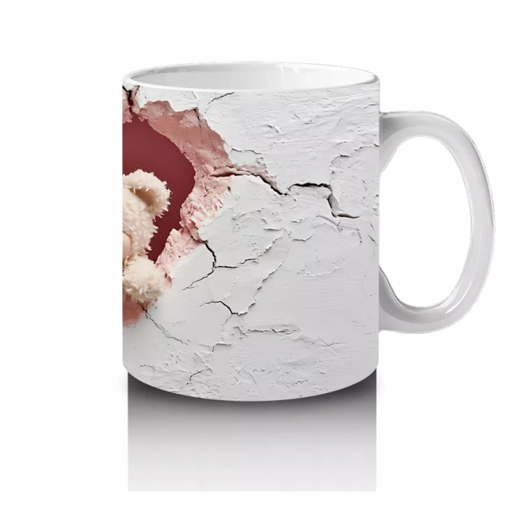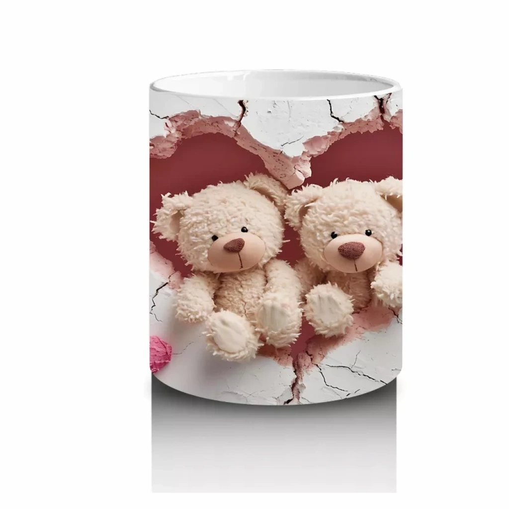 Kalp şeklindeki çatlağın içinde oturan bu sevimli ayıcıklar, sıcaklık ve sevgiyi aynı anda yansıtıyor. Romantik detayları sevenler için hem dekoratif hem anlamlı bir kupa tasarımı.