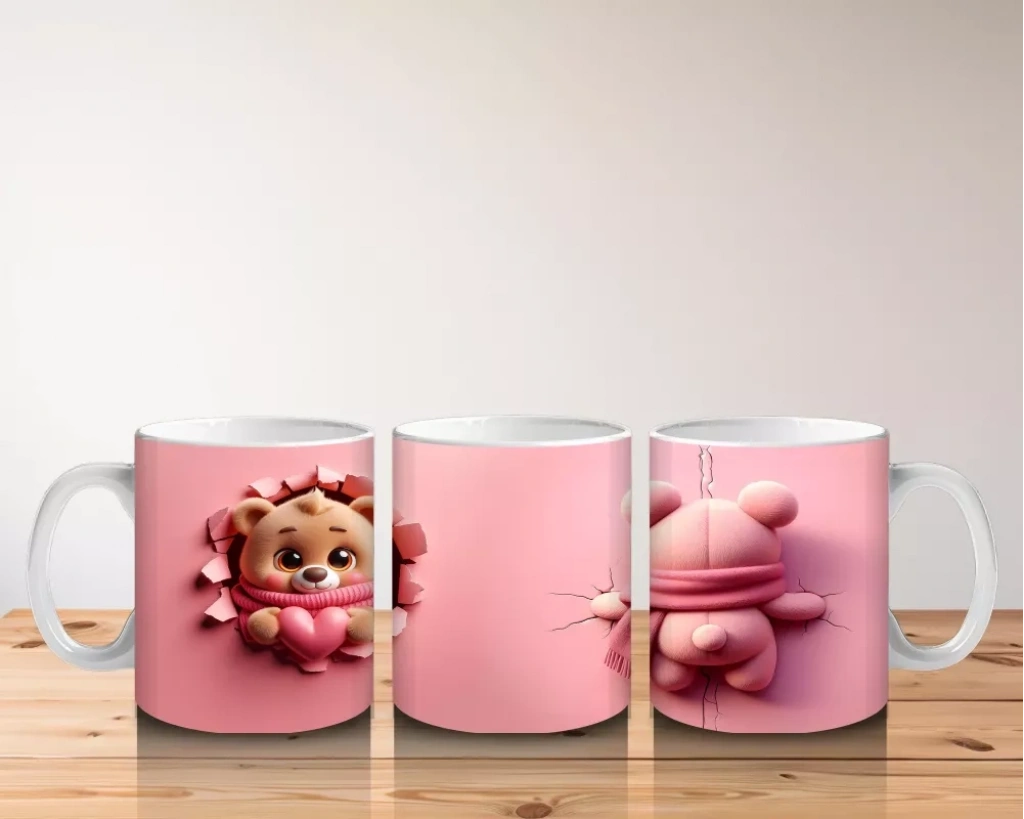 Kalpli figür tutan sevimli ayıcık karakteri, ön ve arka yüzeyde sevgi dolu ve tatlı bir görünüm sunuyor. Romantik ve içten tasarımlar arayanlar için ideal bir kupa.