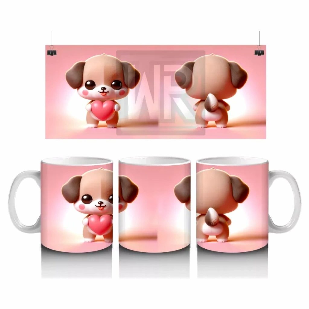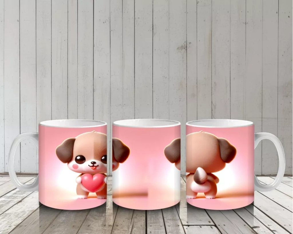Kalpli figür tutan sevimli köpekçik, ön ve arka yüzeyde sıcak ve sevimli bir atmosfer yaratıyor. Romantik ve samimi tasarımlar arayanlar için özel bir kupa alternatifi.