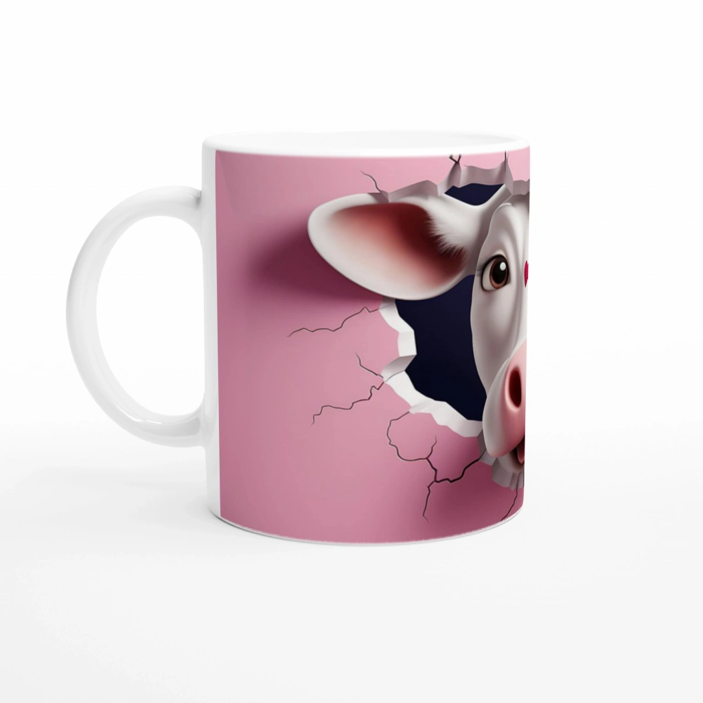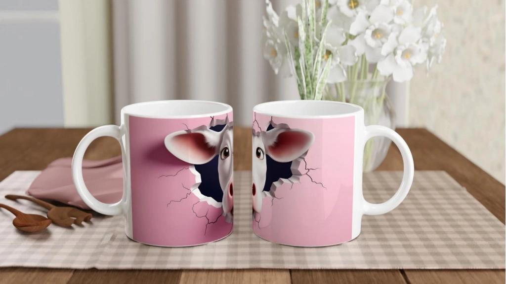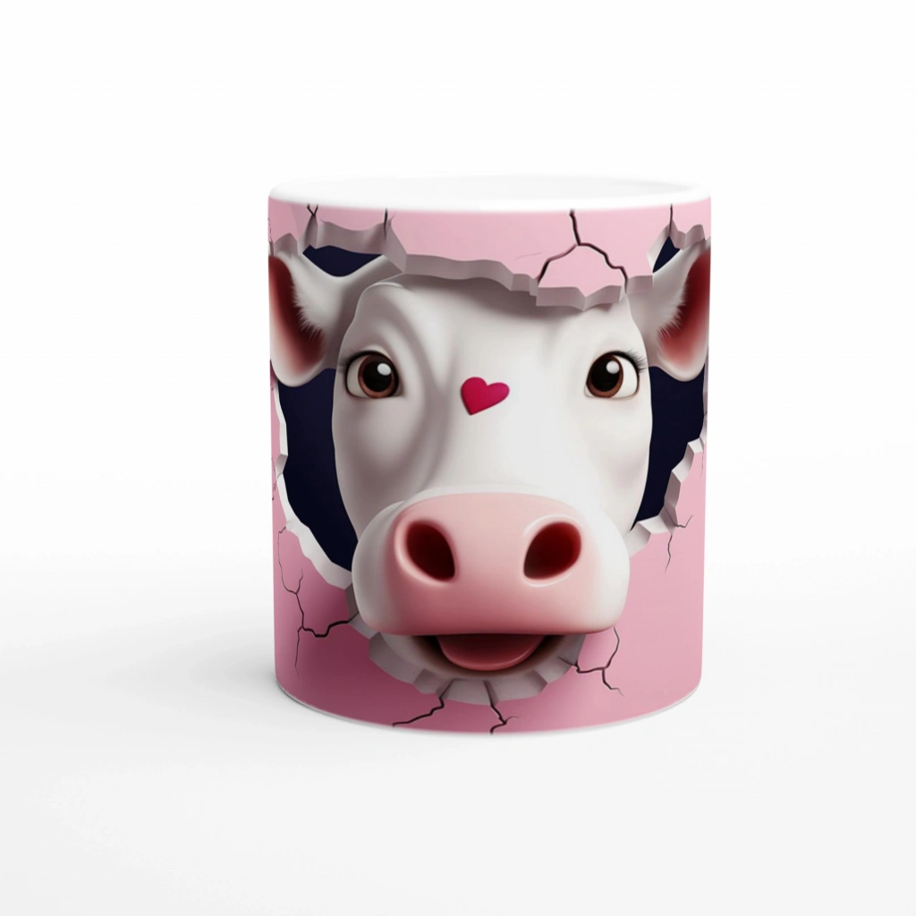 Kalpli Gözlü Sevimli İnek Temalı Baskılı Kupa Bardak, pembe çatlak arka plan üzerinde belirginleşen masum inek yüzüyle dikkat çekiyor. Hem eğlenceli hem de sevgi dolu bir hediye alternatifi arayanlar için ideal.